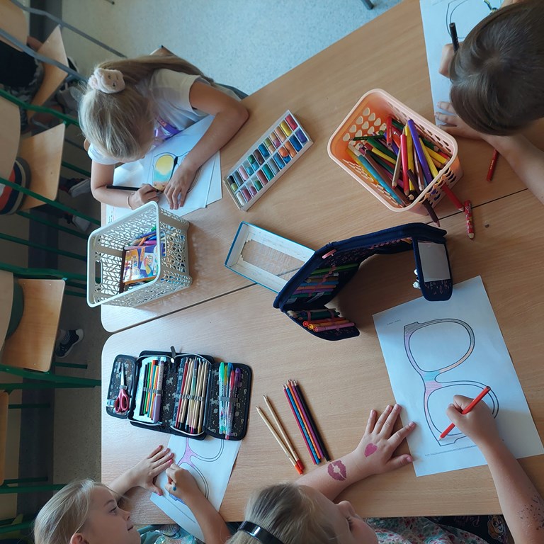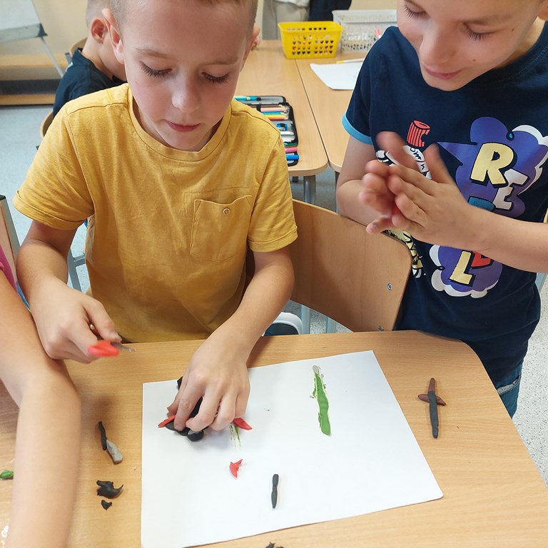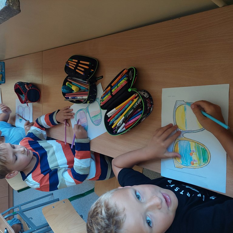 Podczas pierwszych zajęć plastycznych mali giganci z wielkim zaangażowaniem i radością wykonywali prace plastyczne związane ze wspomnieniami wakacyjnych przygód.