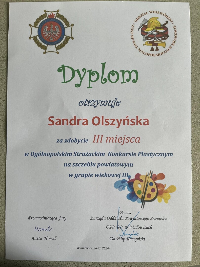 Nasi uczniowie angażują się w różne działania na wielu płaszczyznach. Jednym z takich przykładów, a zarazem sukcesem jest udział naszej uczennicy Sandry Olszyńskiej w Ogólnopolskim Konkursie Strażackim. Sandra uzyskała III miejsce na szczeblu powiatowym za wykonanie pracy plastycznej.