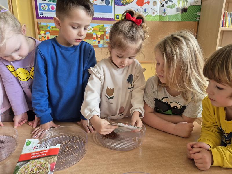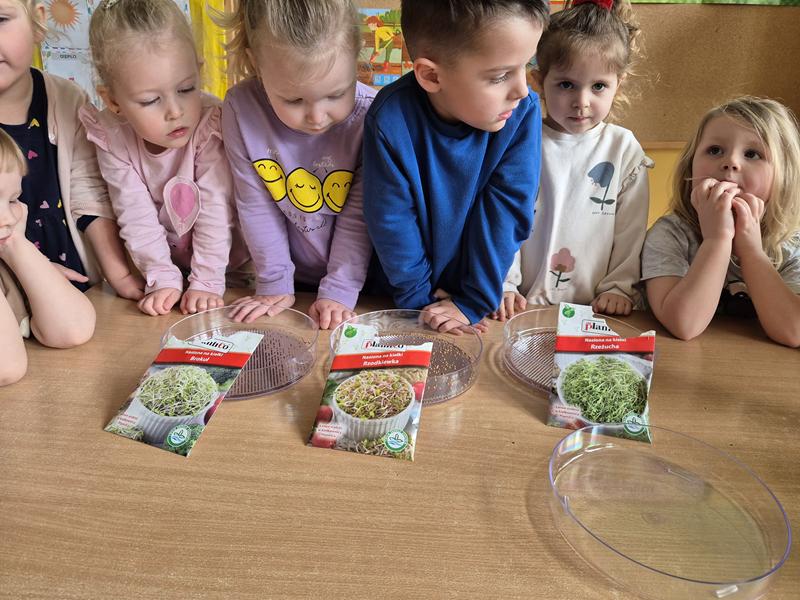 Obecnie Motylki założyły hodowlę kiełków w kiełkownicy. Dzieci dowiedziały się, że kiełki to samo zdrowie, a sposób ich hodowli odbywa się bez ziemi ogrodniczej – wystarczy przygotować kiełkownicę i stworzyć im odpowiednią wilgotność. Przedszkolaki równomiernie wyłożyły na tackach kiełkownicy nasiona: rzeżuchy, rzodkiewki i brokułu. Dzieci dowiedziały się, rośliny magazynują w nasionach zapasy witamin, minerałów, białka. W kiełkach jest wszystko co najlepsze i to w bardzo dużych dawkach – są skarbnicą witaminy B,C, D, E, PP, K, a także mają sporo żelaza, fosforu, cynku, jodu, i błonnika. Teraz tylko pozostało nam obserwować proces kiełkowania i korzystać z dobrodziejstw tych roślin.