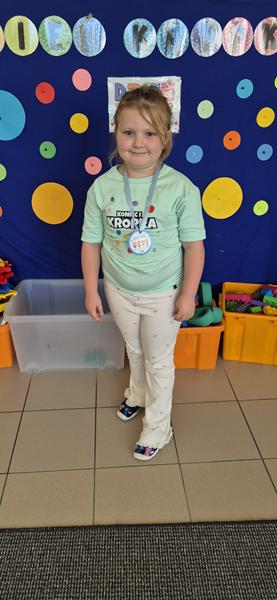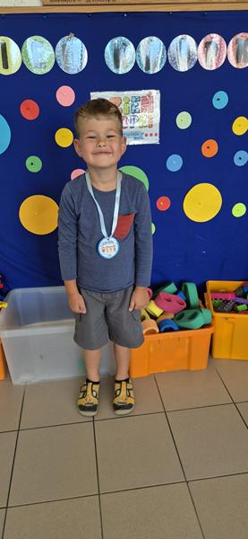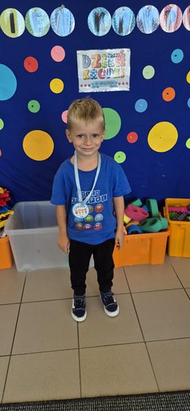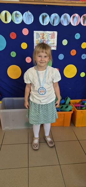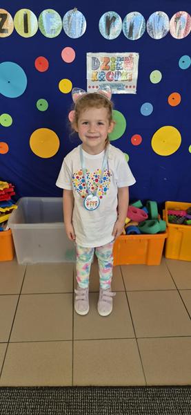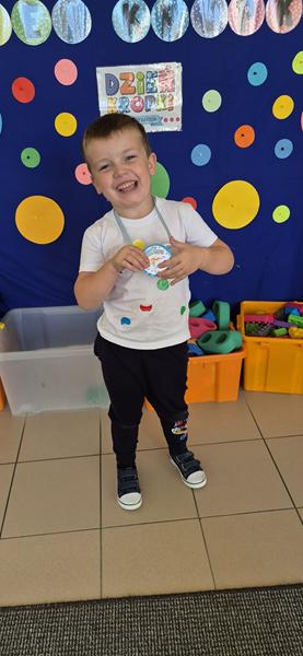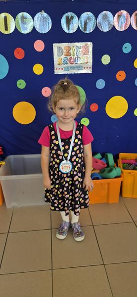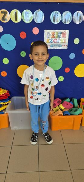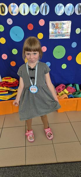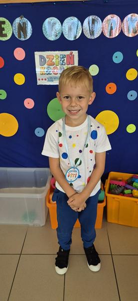 Tego dnia nasze ubrania wypełnione były kolorowymi kropkami. Na zajęciach uważnie wysłuchaliśmy opowiadania jak to zwyczajna kropka zmieniła świat małej dziewczynki o imieniu Vashti. Historia ta uświadomiła przedszkolakom, że każdy z nas ma jakieś ukryte zdolności, TALENT. Dostrzegaliśmy, że świat składa się z kropek małych i dużych. Kropki gościły w zabawach ruchowych jak i pracy plastycznej. Na zakończenie każde dziecko otrzymało medal.