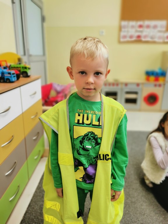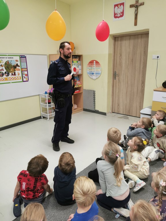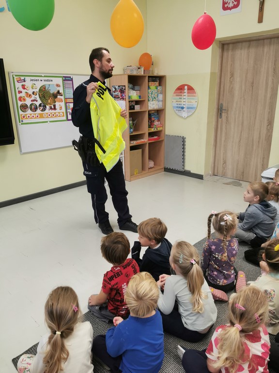 Podczas zajęć przedszkolaki dowiedziały się, jak prawidłowo przechodzić przez jezdnię 🚸, dlaczego warto nosić elementy odblaskowe ✨. Pan policjant przypomniał również o numerach alarmowych i zachęcał dzieci do dbania o swoje bezpieczeństwo każdego dnia.