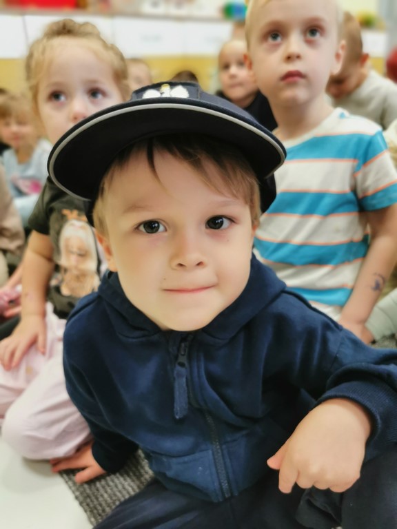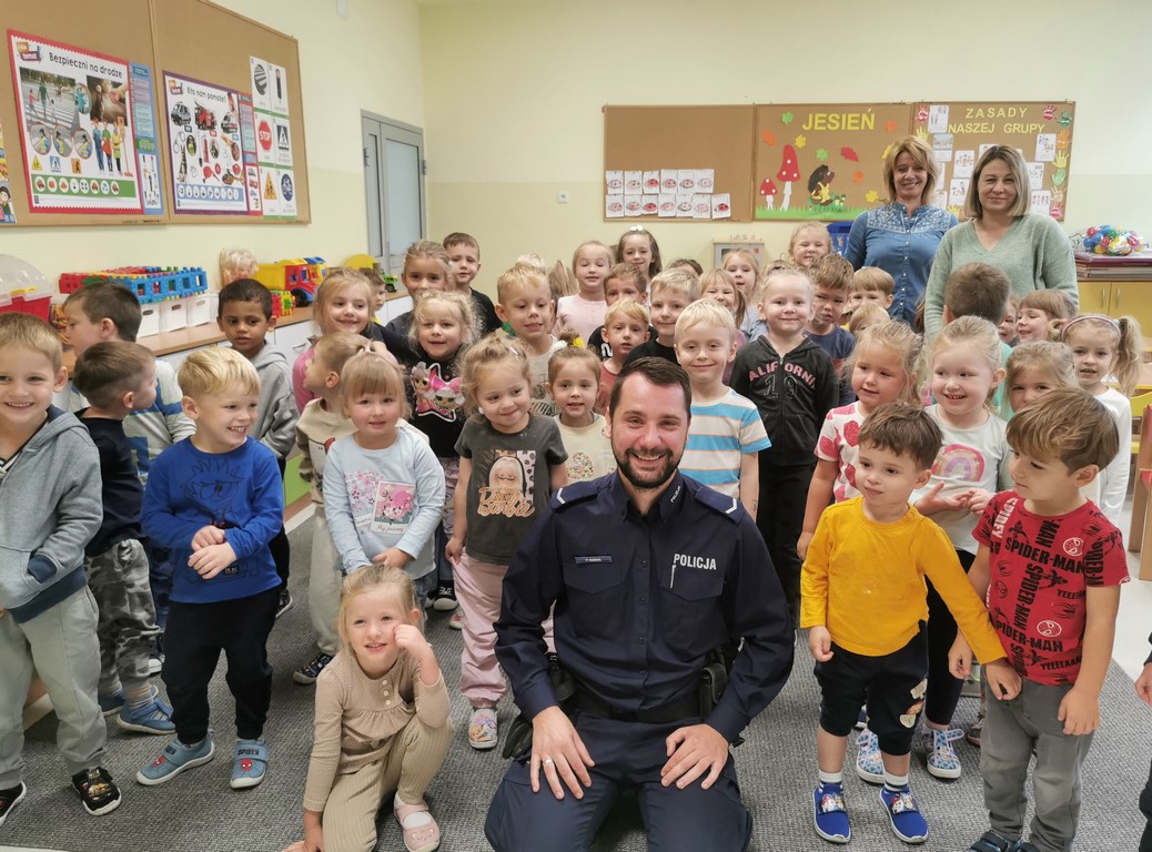 W środę, 1 października, nasze przedszkole odwiedził wyjątkowy gość – pan policjant - sierżant Patryk Kozioł z Komisariatu Policji w Brzeźnicy🚓. Spotkanie miało na celu przypomnienie dzieciom zasad bezpiecznego zachowania w różnych sytuacjach – zarówno na drodze, jak i w kontaktach z nieznajomymi.