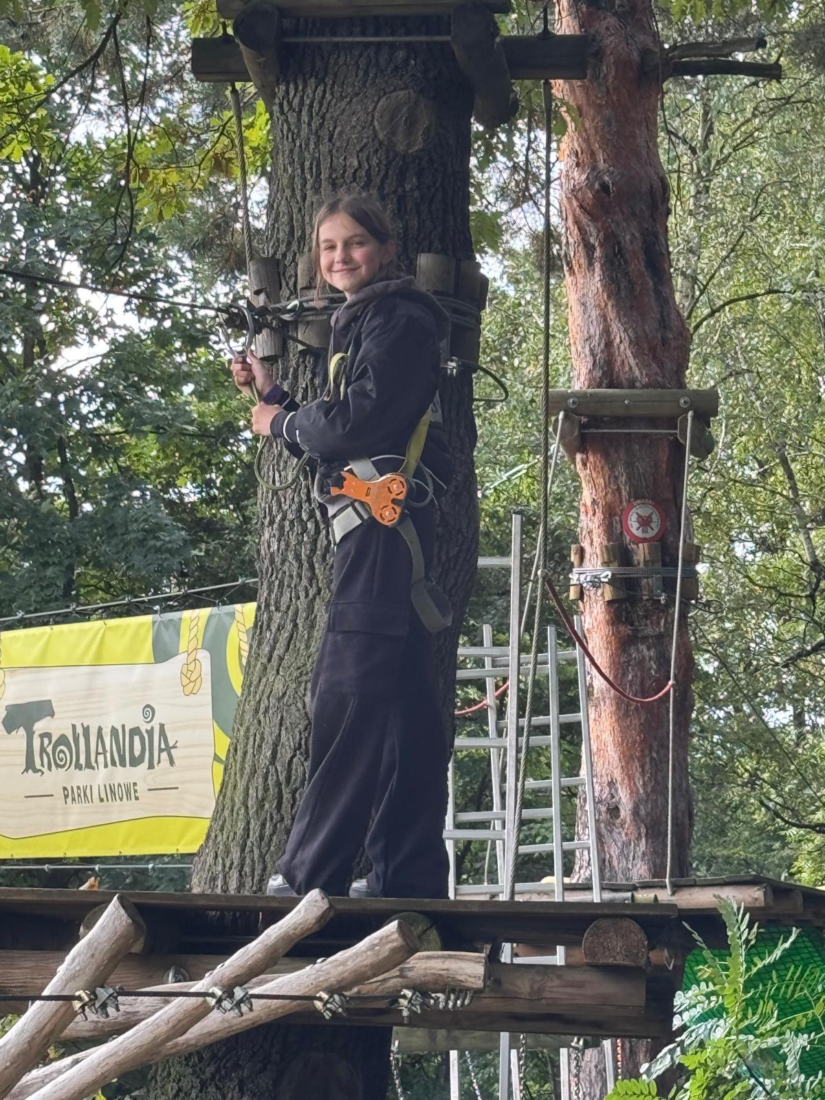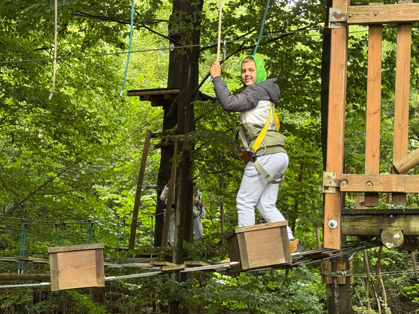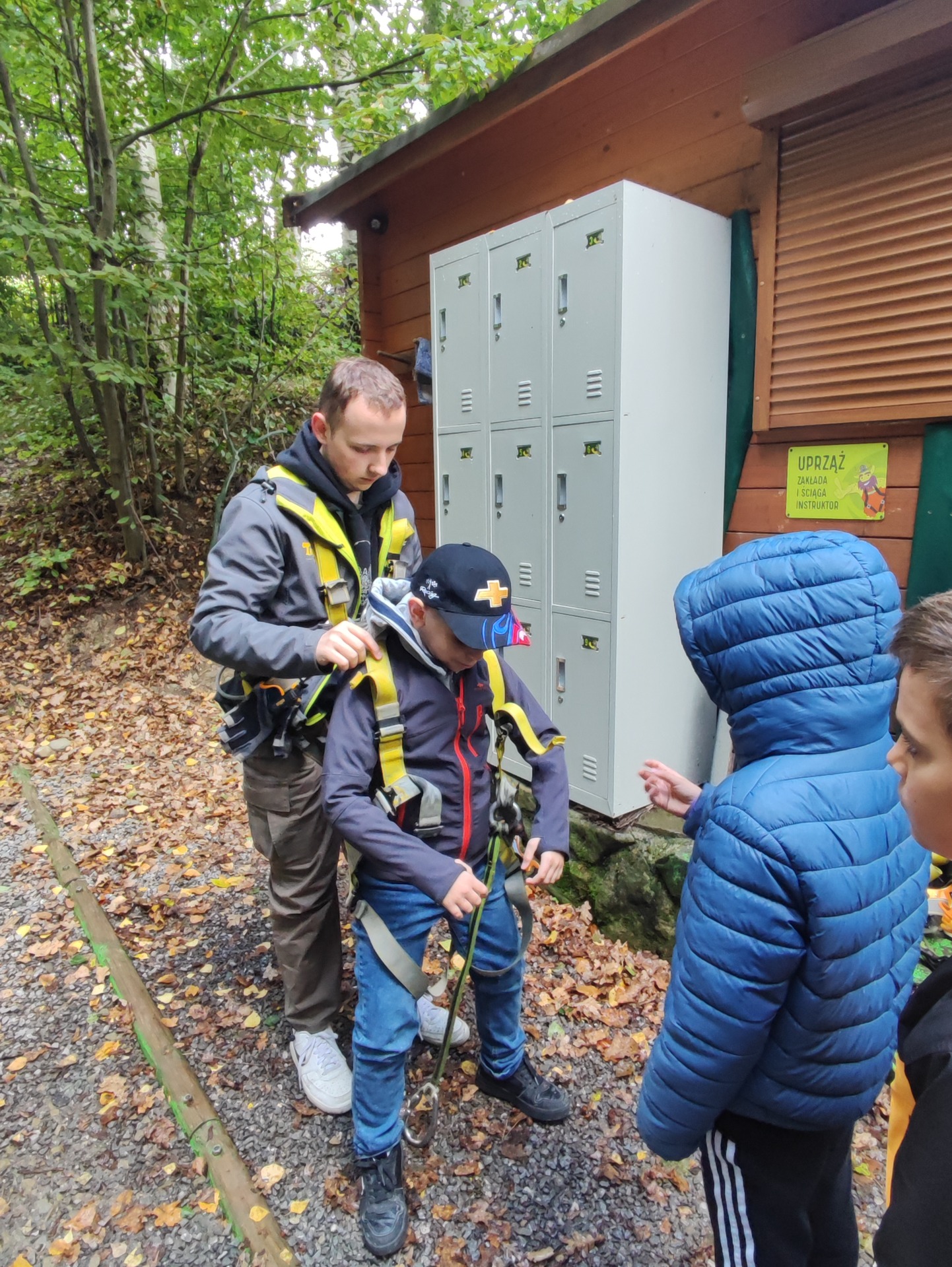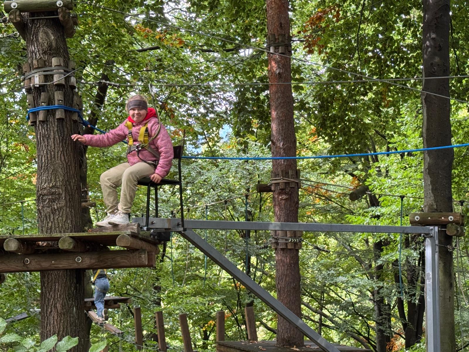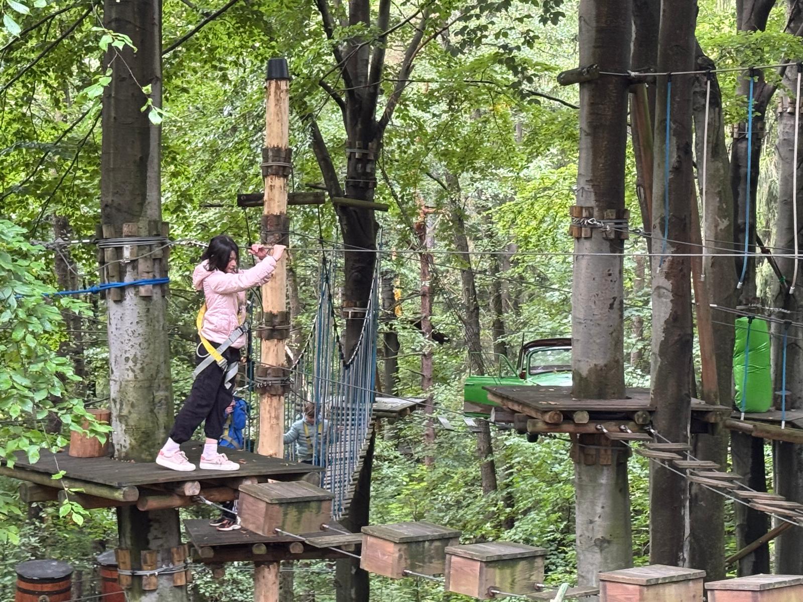 Po dotarciu na miejsce uczestnicy zostali podzieleni na dwie grupy. Pierwsza grupa wyjechała kolejką na szczyt, by podziwiać malownicze krajobrazy Beskidu Małego. Był czas na wspólne zdjęcia z panoramą w tle oraz drobne zakupy w sklepiku z pamiątkami. Druga grupa w tym czasie próbowała swoich sił w parku linowym – pełnym mostków, przeszkód i zjazdów, które wymagały odwagi, równowagi i sporej dawki energii. Po chwili role się odwróciły – każdy uczeń miał okazję zarówno podziwiać górskie widoki, jak i poczuć dreszczyk emocji w parku linowym.