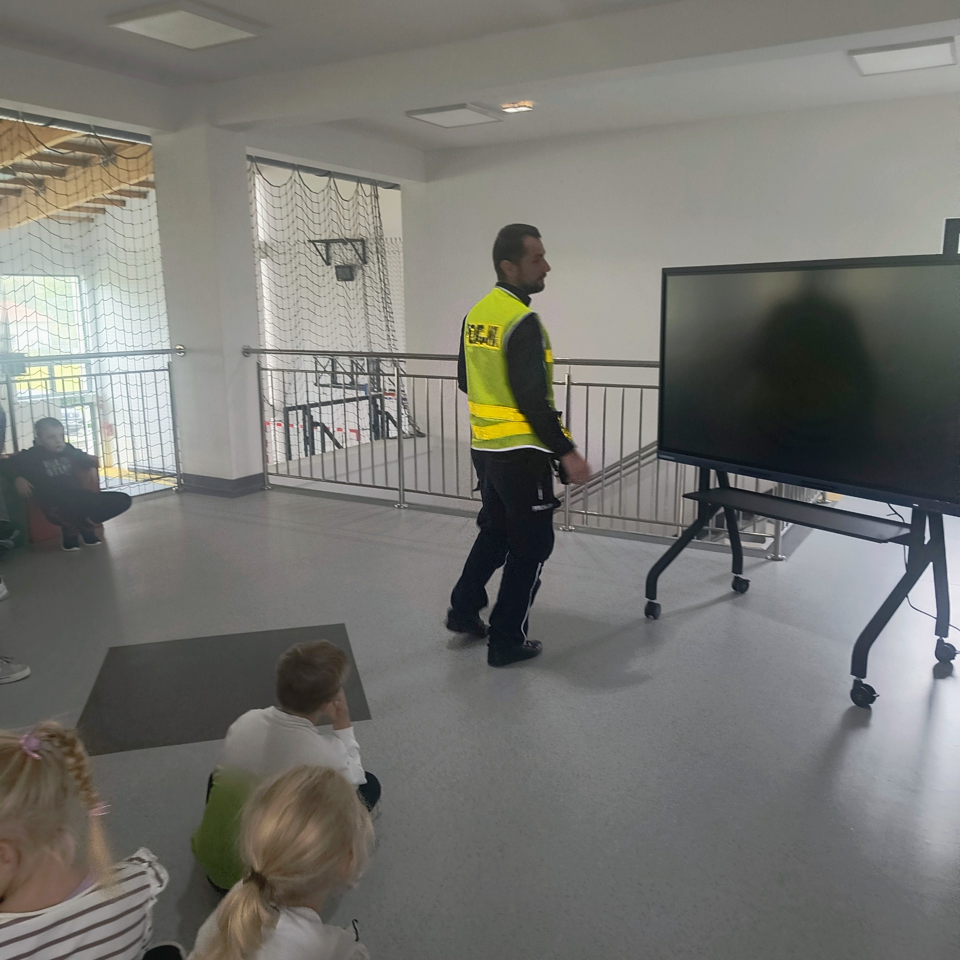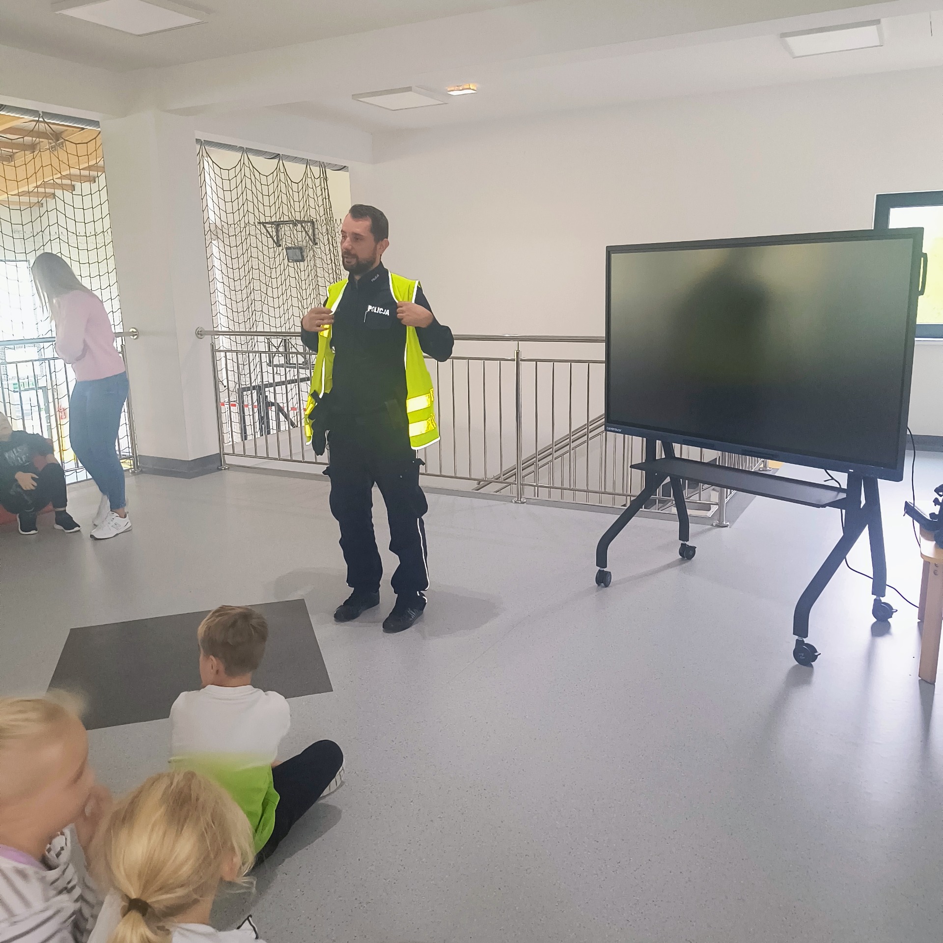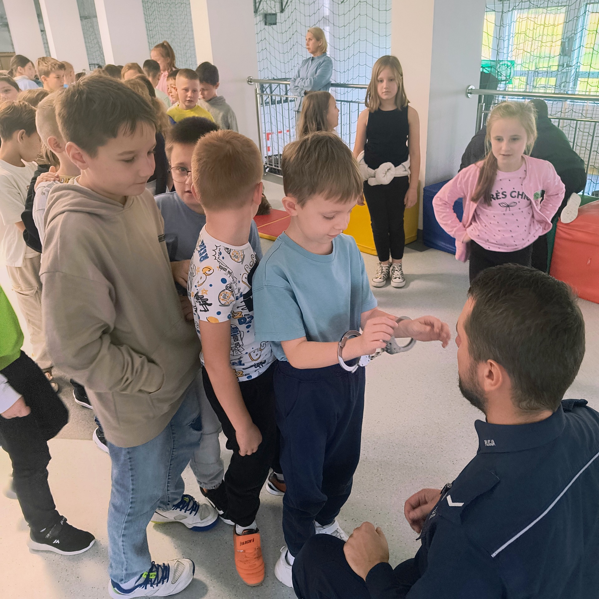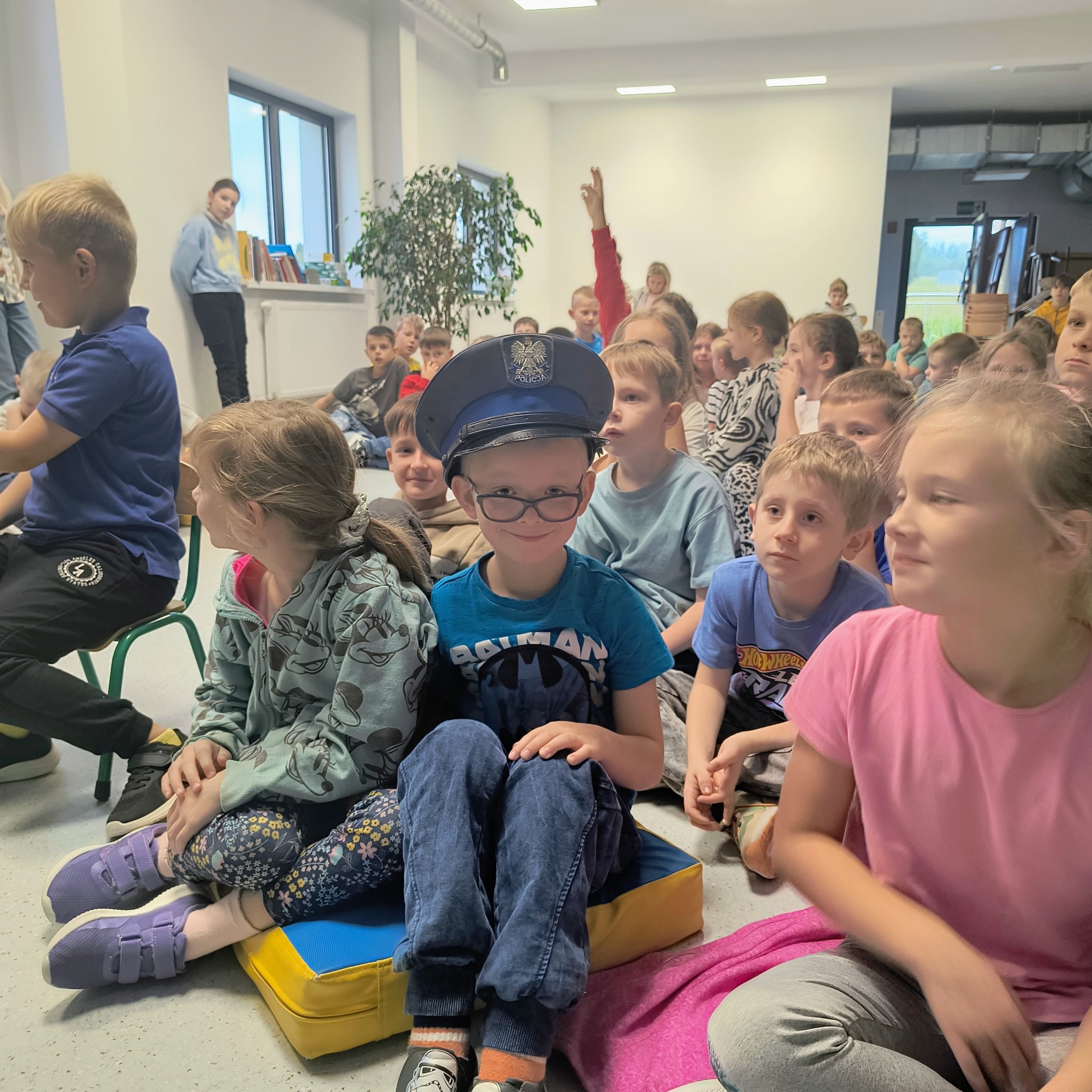 Dnia 1 października w ramach ogólnopolskiego konkursu „Odblaskowa Szkoła” uczniowie klas I–IV wzięli udział w spotkaniu z asp. Patrykim Kozioł z Komisariatu w Brzeźnicy. Dzieci przypomniały sobie zasady bezpiecznego poruszania się po drodze oraz dowiedziały się, jak ważne jest noszenie elementów odblaskowych, zwłaszcza w okresie jesiennym, gdy szybko zapada zmrok i pogarszają się warunki atmosferyczne.