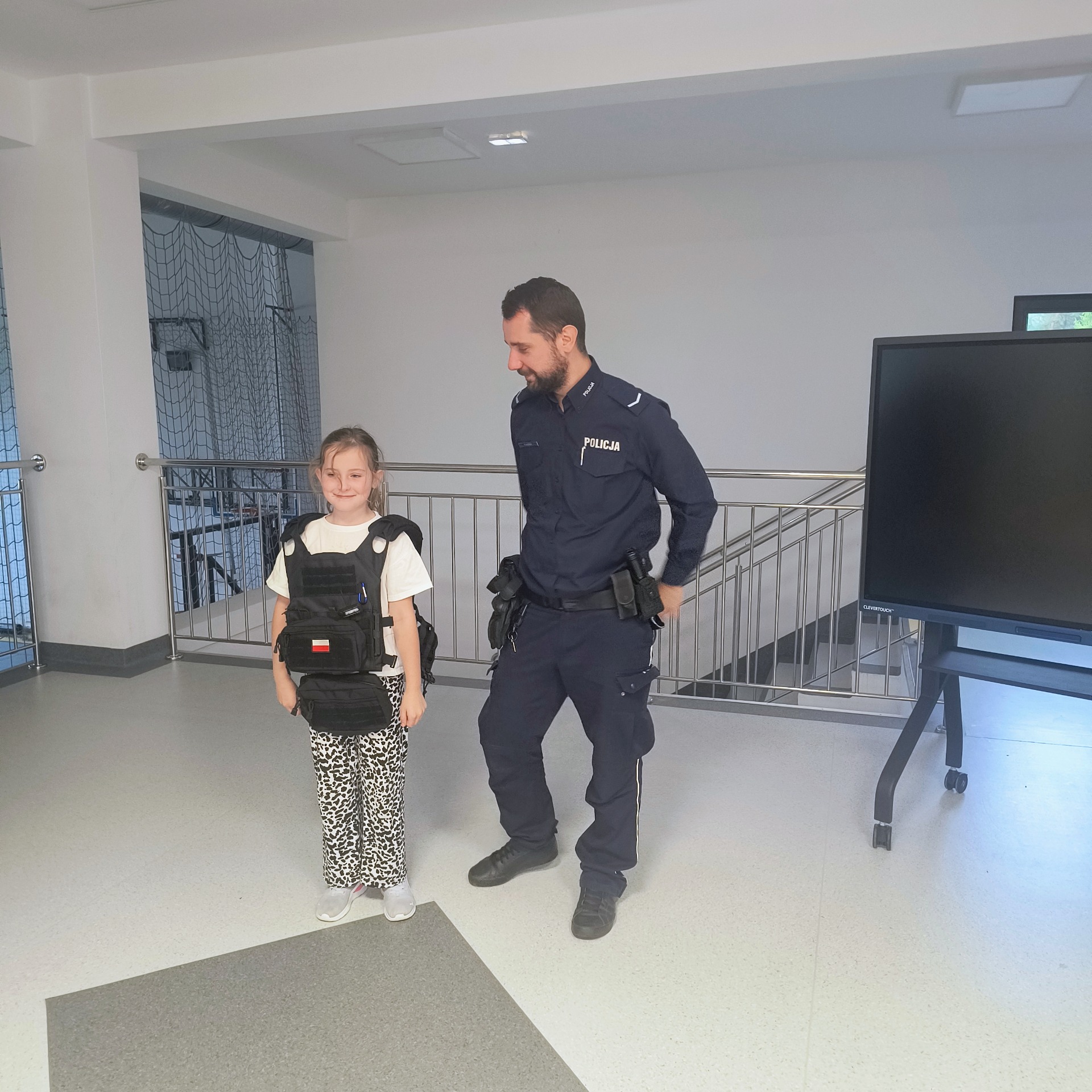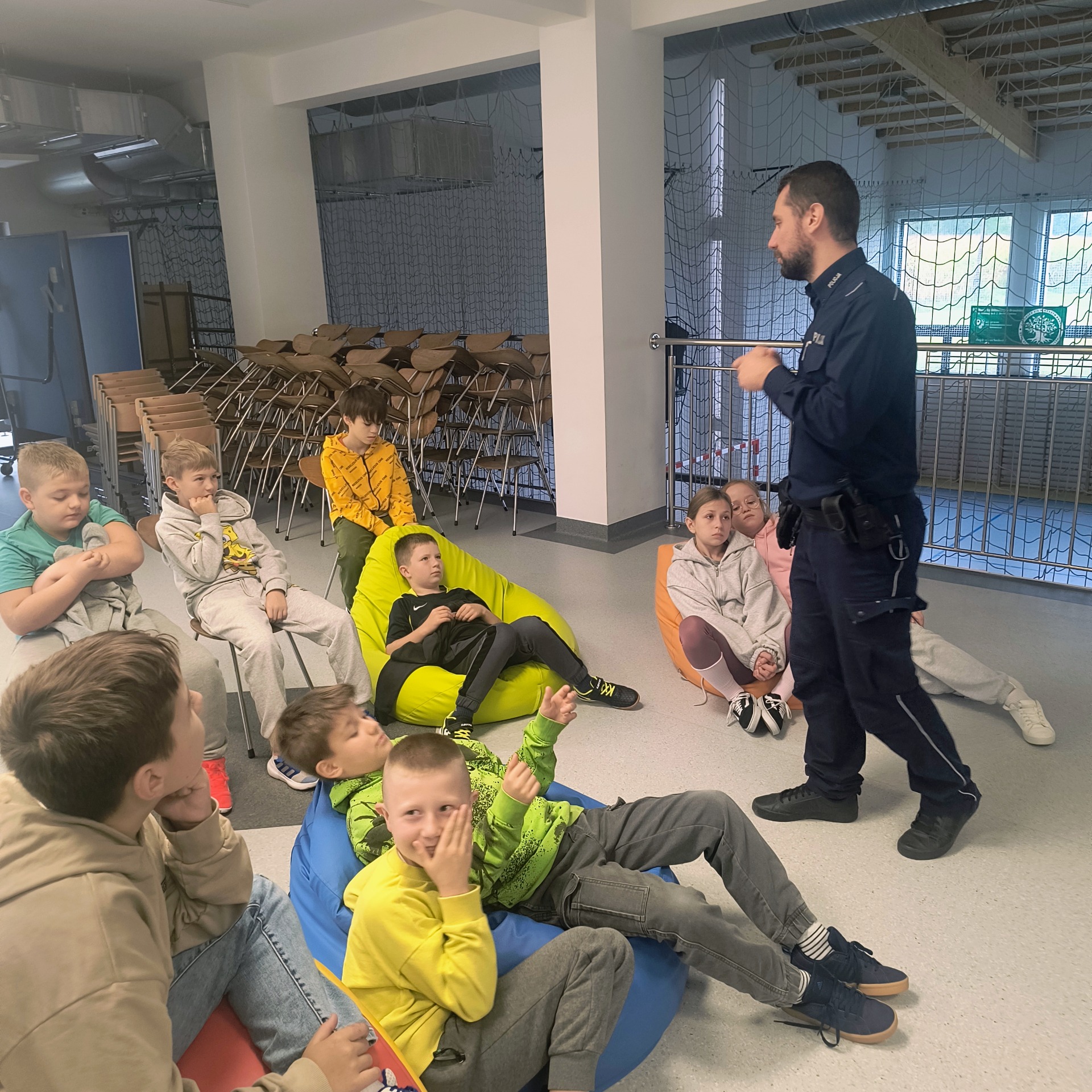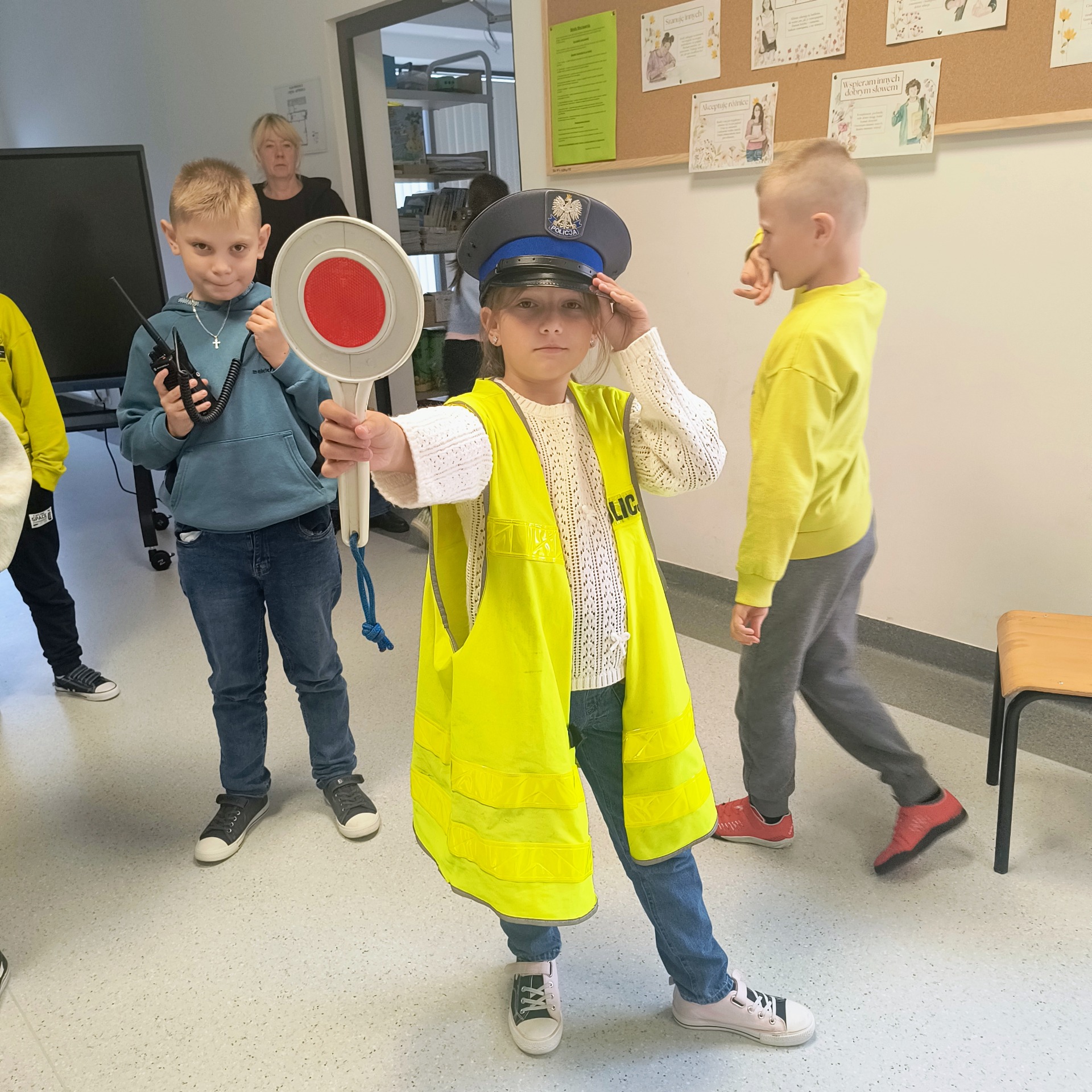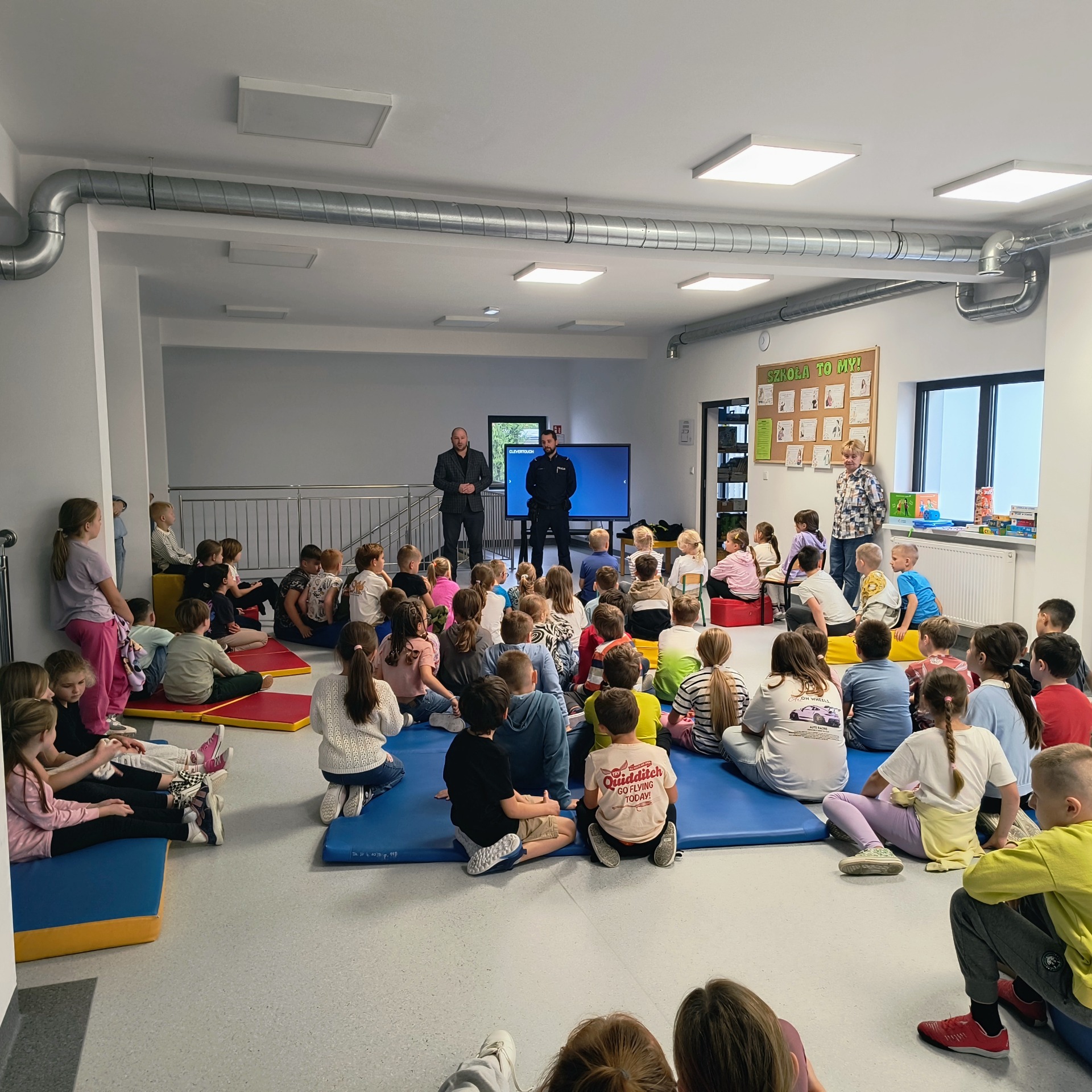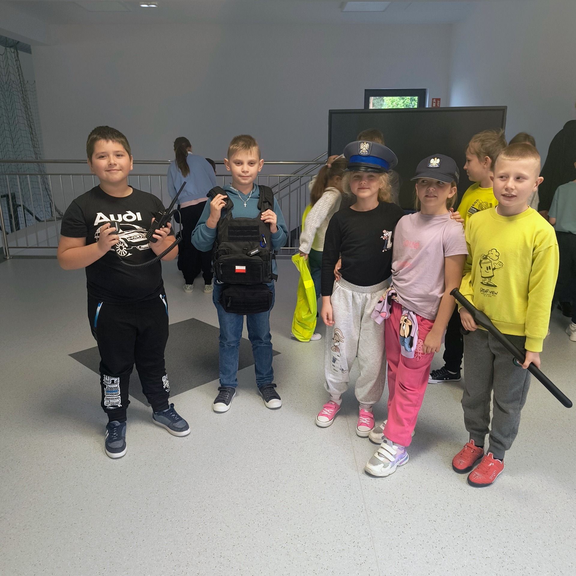 Dnia 1 października w ramach ogólnopolskiego konkursu „Odblaskowa Szkoła” uczniowie klas I–IV wzięli udział w spotkaniu z asp. Patrykim Kozioł z Komisariatu w Brzeźnicy. Dzieci przypomniały sobie zasady bezpiecznego poruszania się po drodze oraz dowiedziały się, jak ważne jest noszenie elementów odblaskowych, zwłaszcza w okresie jesiennym, gdy szybko zapada zmrok i pogarszają się warunki atmosferyczne.