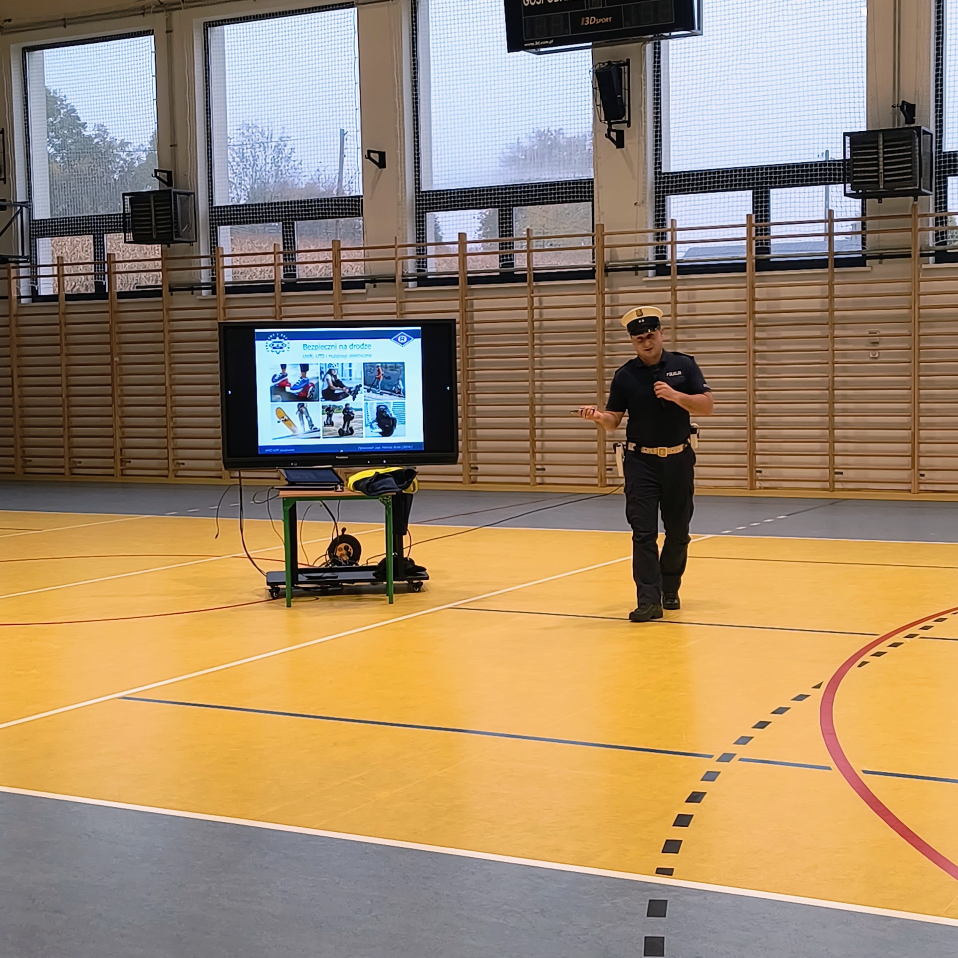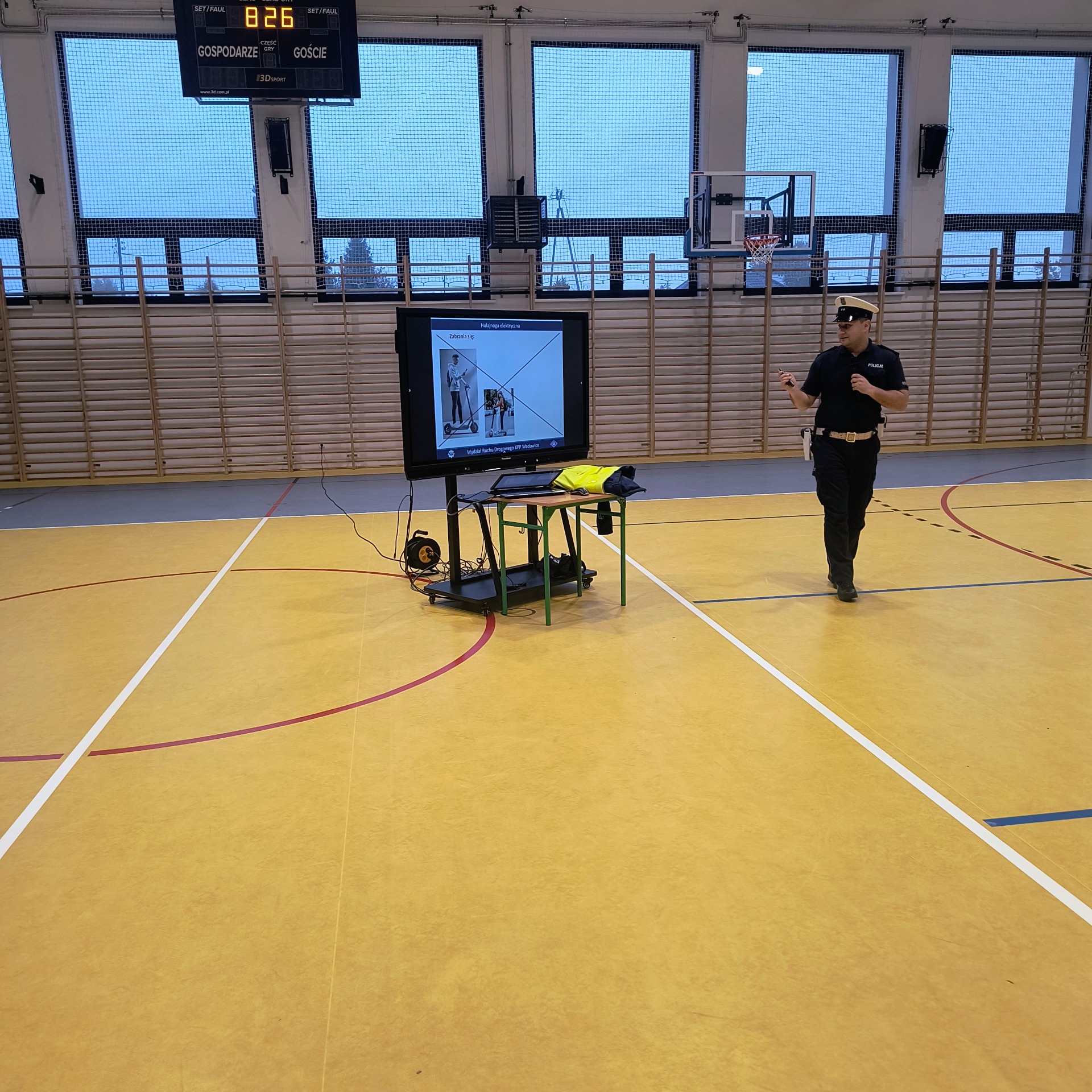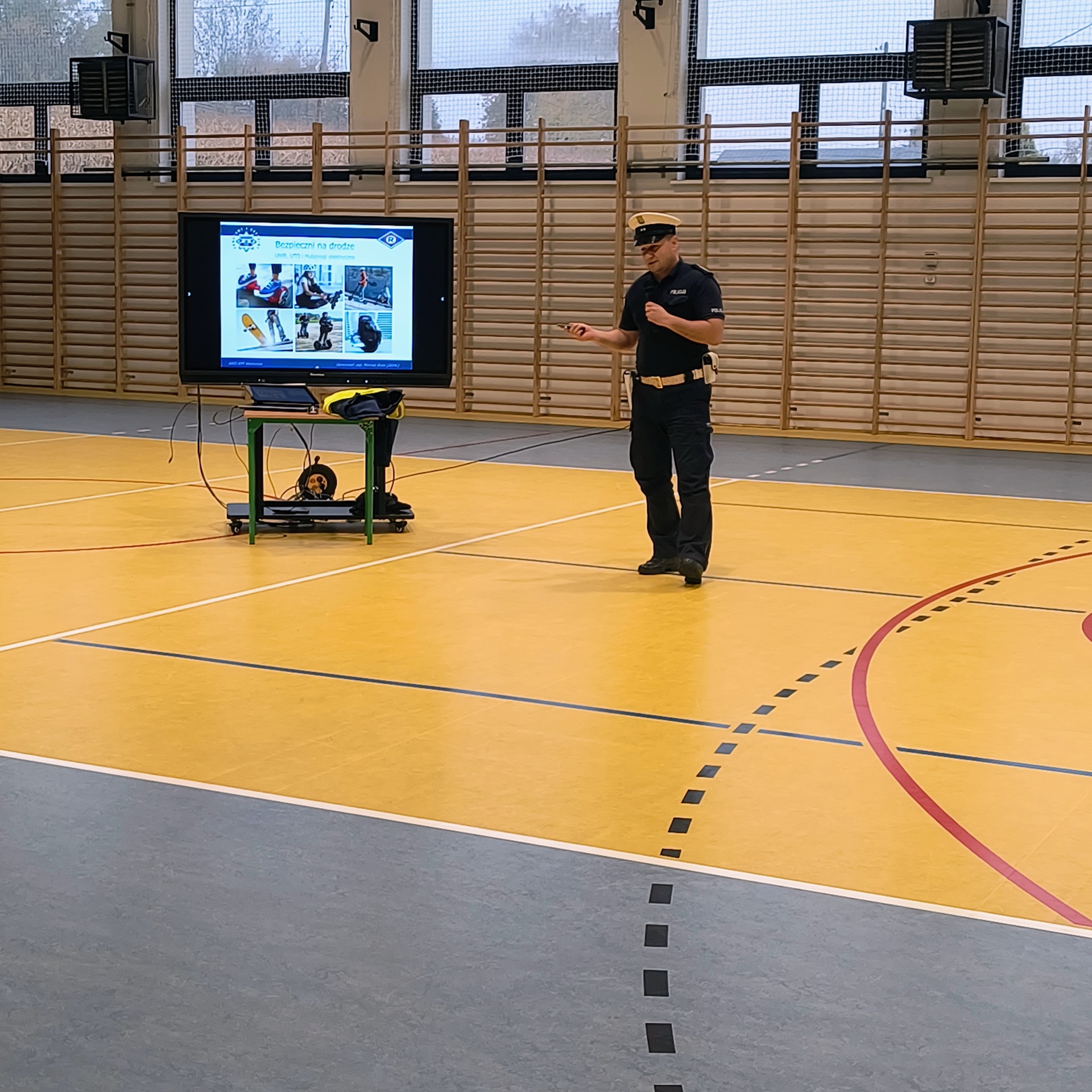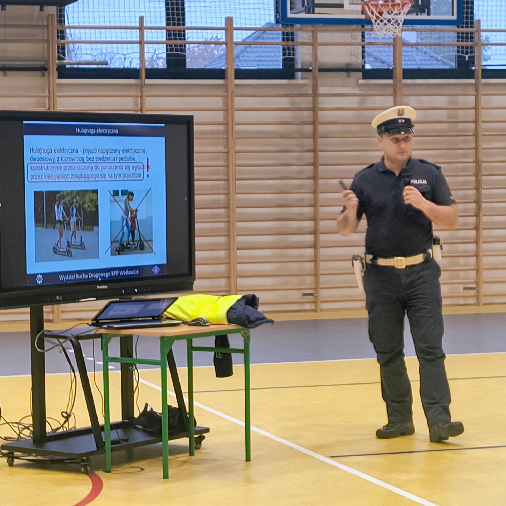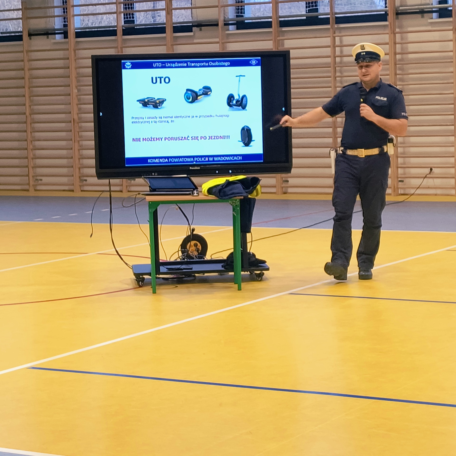 Dla uczniów klas V–VIII funkcjonariusz przeprowadził również prelekcję dotyczącą zasad odpowiedzialnego korzystania z hulajnóg elektrycznych, urządzeń transportu osobistego (UTO) oraz urządzeń wspomagających ruch (UWR).