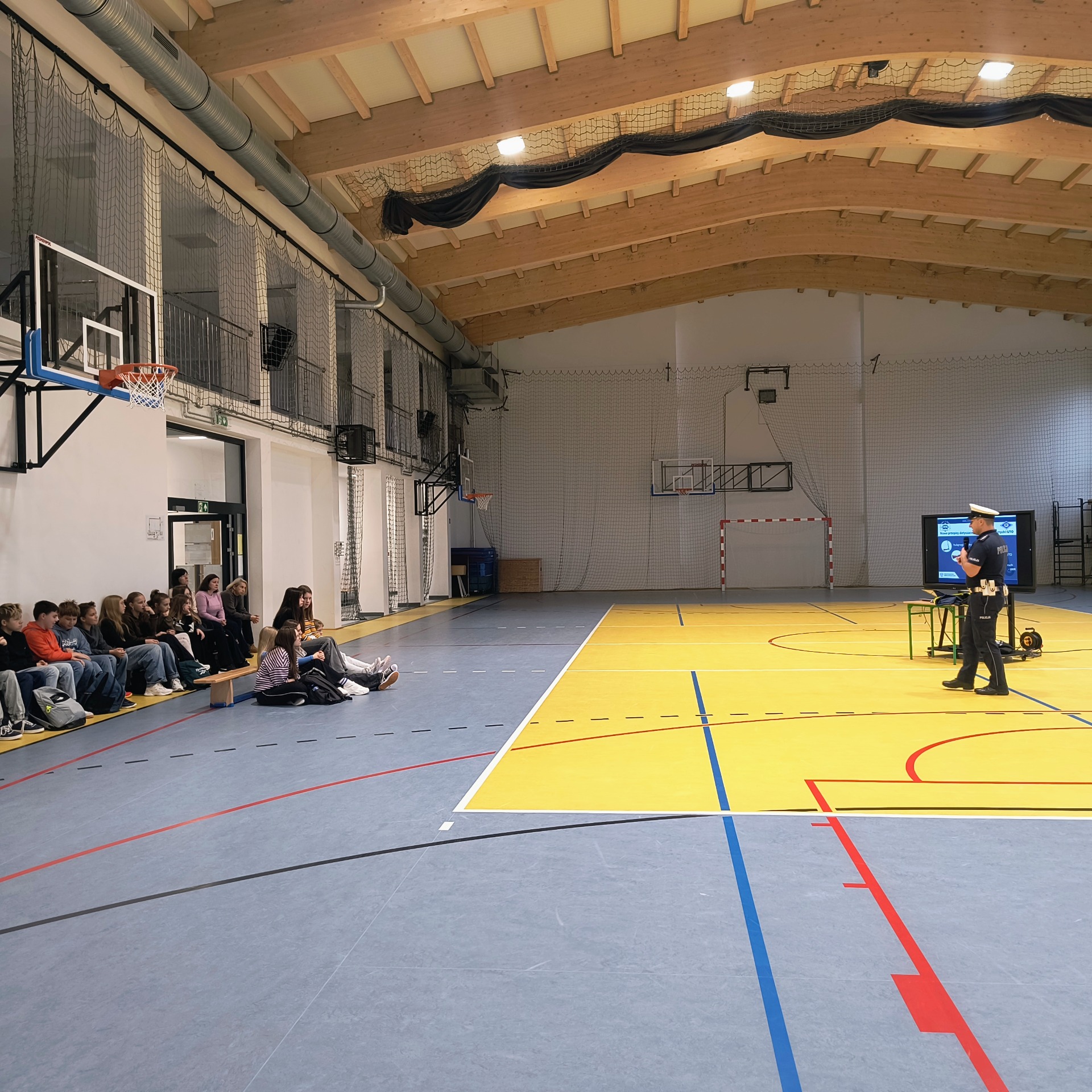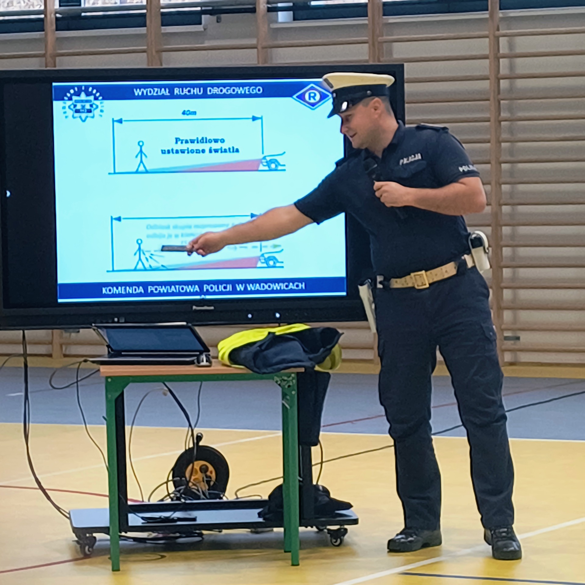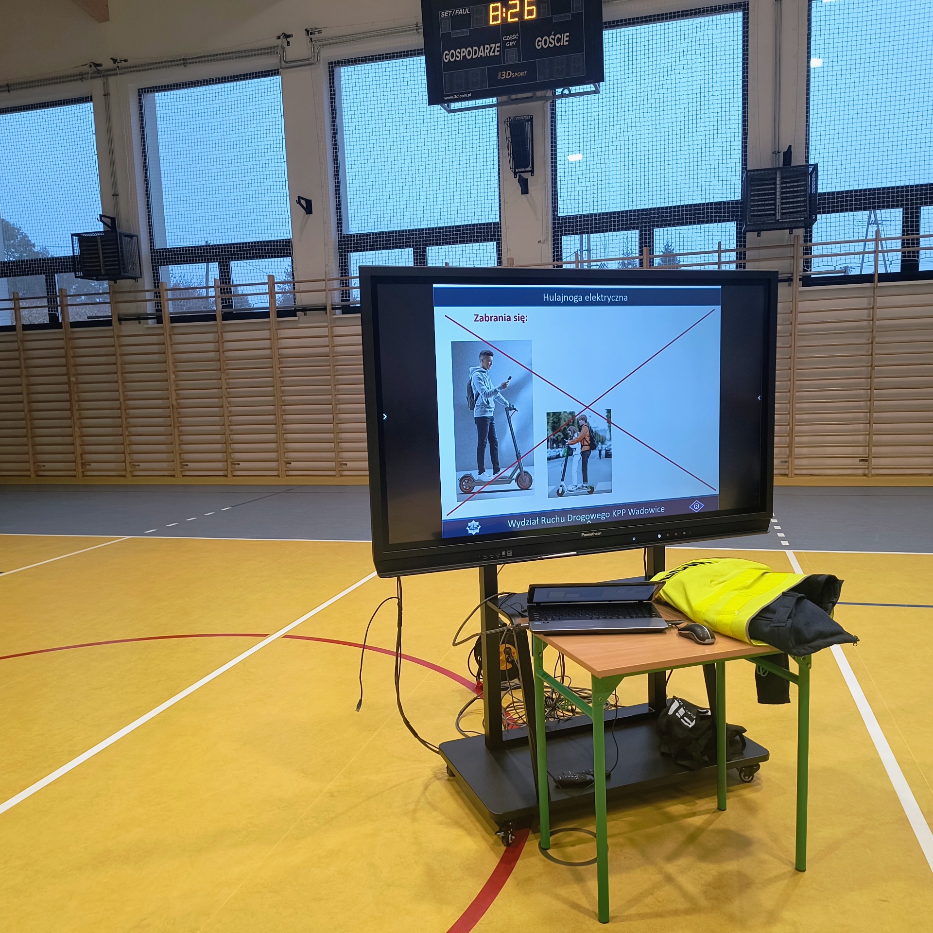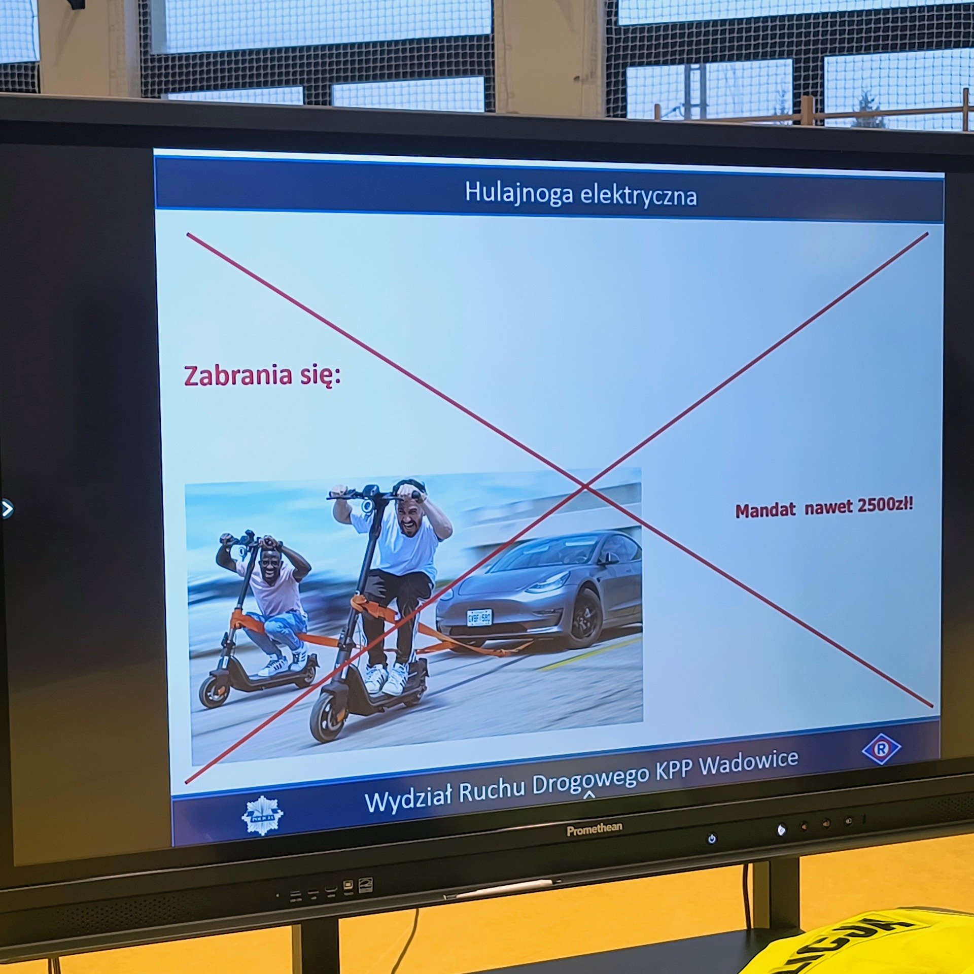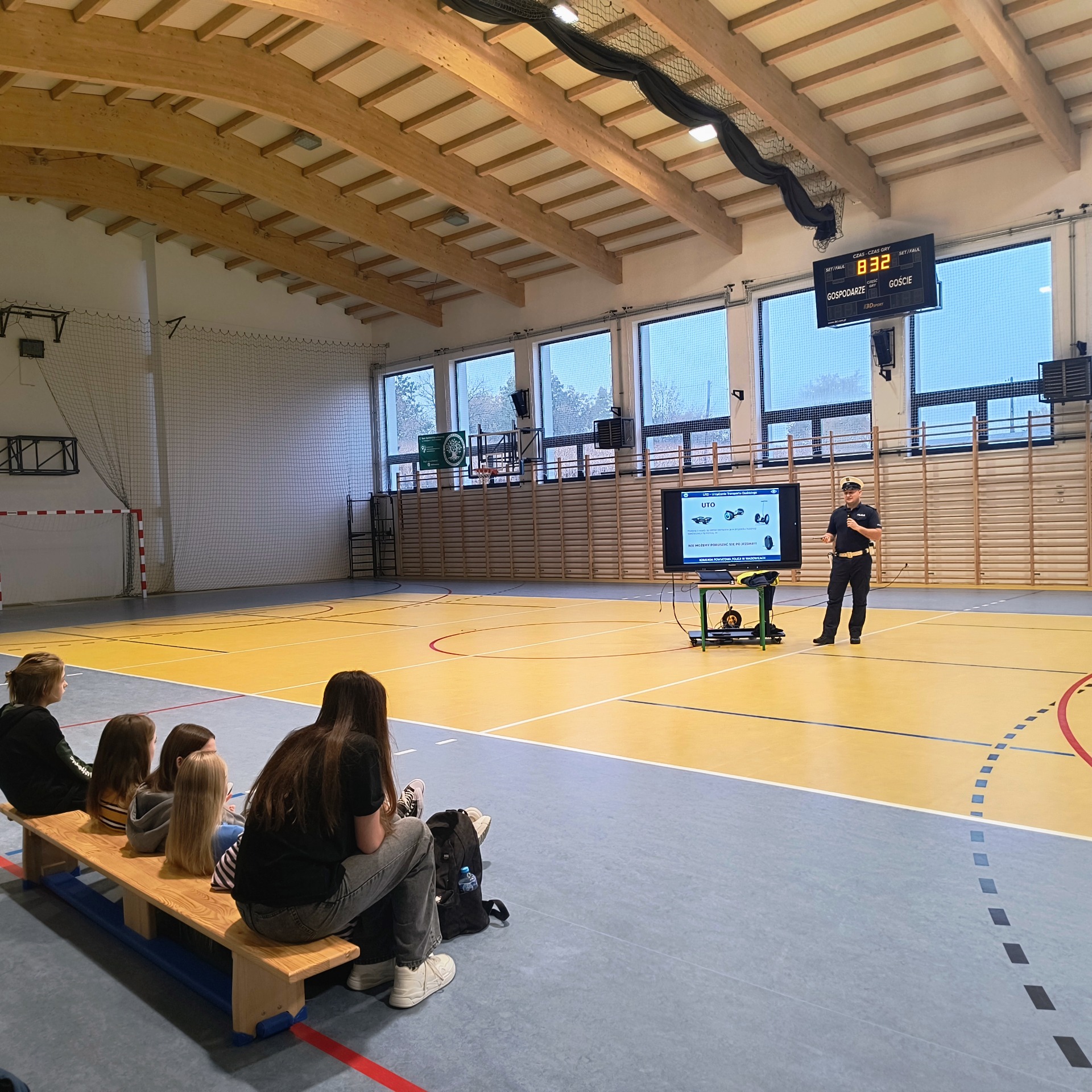 Dla uczniów klas V–VIII funkcjonariusz przeprowadził również prelekcję dotyczącą zasad odpowiedzialnego korzystania z hulajnóg elektrycznych, urządzeń transportu osobistego (UTO) oraz urządzeń wspomagających ruch (UWR).