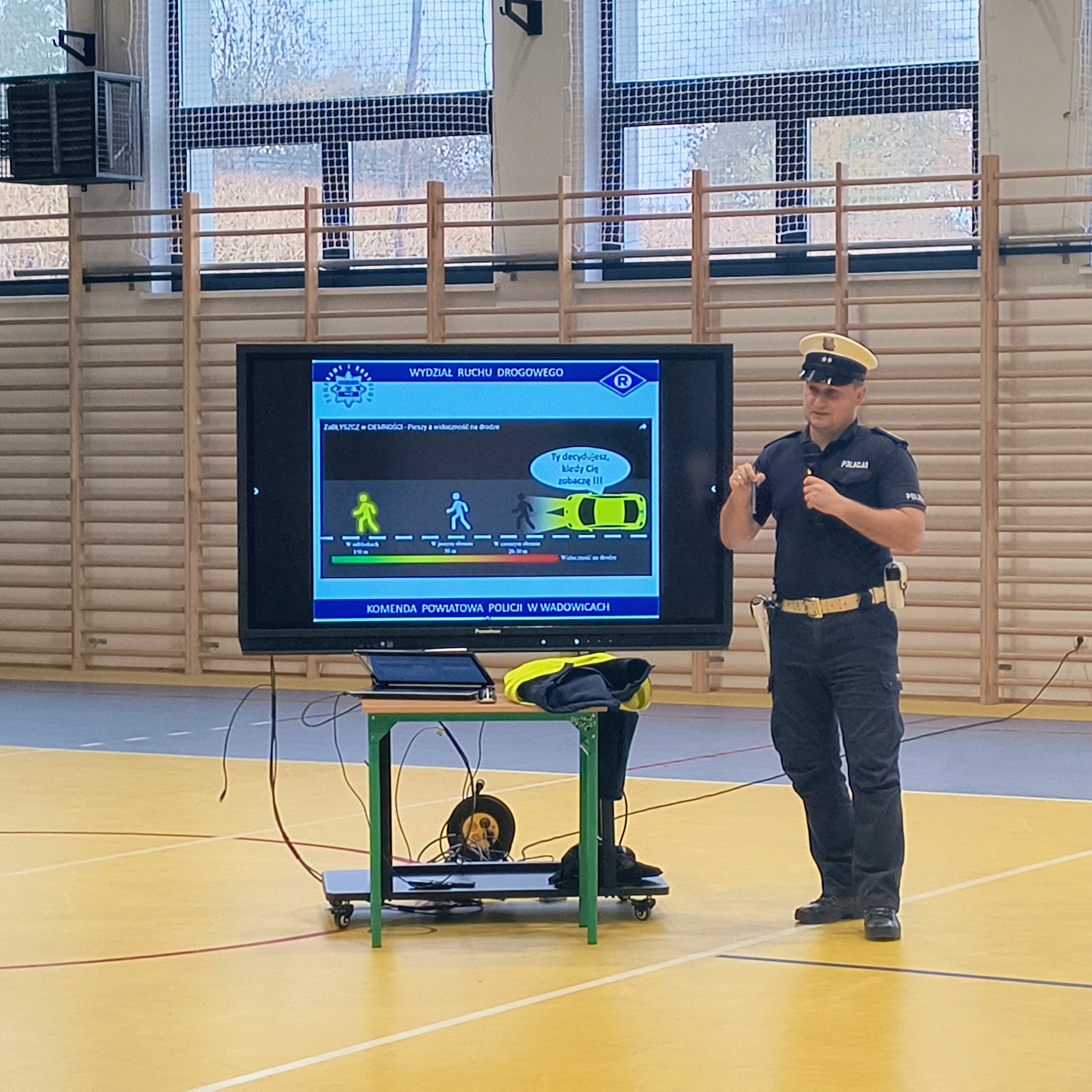 Jednym z działań były zajęcia edukacyjne, które odbywały się na drodze w pobliżu szkoły i miały na celu uświadomienie wszystkim uczestnikom, jak ważne jest przestrzeganie zasad bezpiecznego poruszania się po drogach. Akcja została przeprowadzona przez funkcjonariusza Komendy Powiatowej Policji w Wadowicach we współpracy z uczniami naszej szkoły.