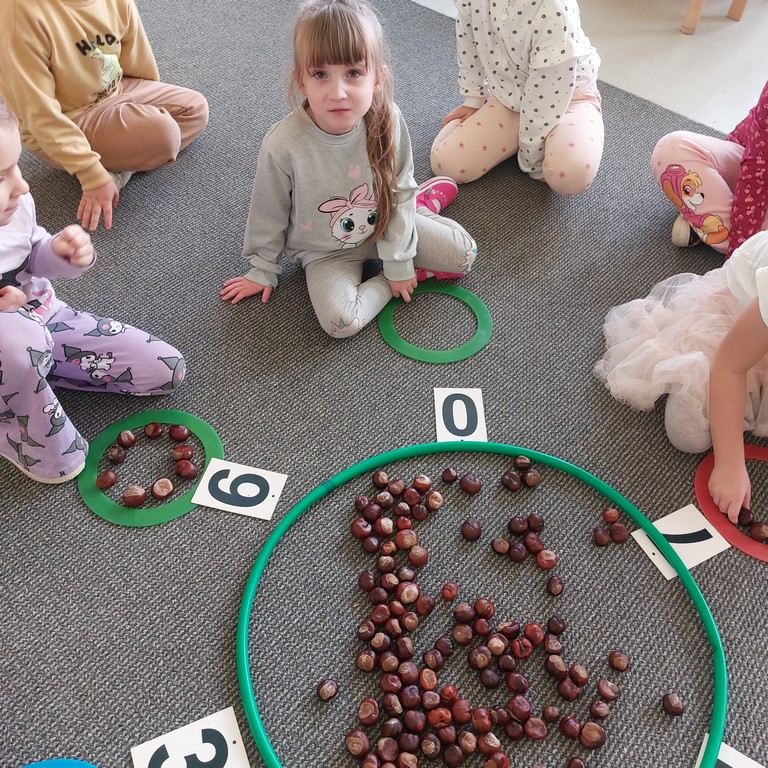Jesień, a zwłaszcza złota polska jesień daje wiele możliwości różnorodnych zabaw w przedszkolu i w domu z wykorzystaniem materiałów przyrodniczych. Ciepłe, piękne dni zachęcały dzieci z grupy „Biedronek” do spacerów i zabaw na przedszkolnym placu zabaw. Dzieci podziwiały piękno jesiennej przyrody, zbierały jesienne dary do kącika przyrody, chodziły po liściach naśladując ich szelest i doskonaląc przy okazji aparat mowy. Podczas zabaw w sali dzieci korzystały z jesiennych darów - kasztanów, żołędzi, szyszek, liści, orzechów wykorzystując je do zabaw matematycznych, przeliczania, segregowania, układania ciągów rytmicznych, kształtów, poznanych liter i cyfr.