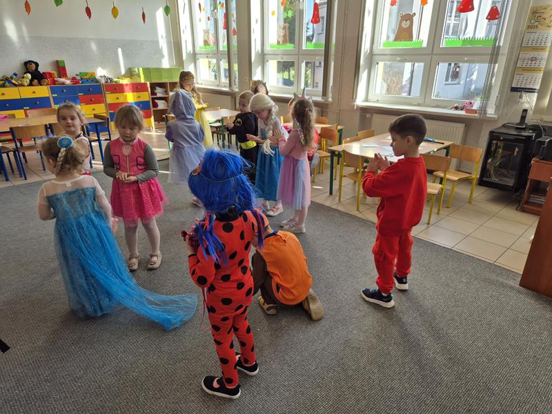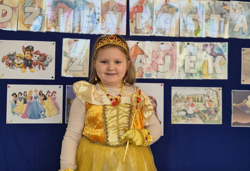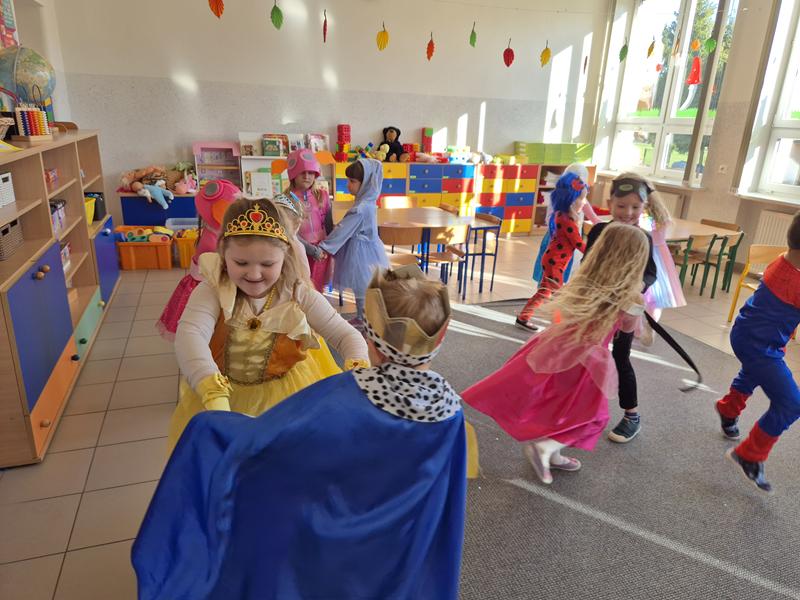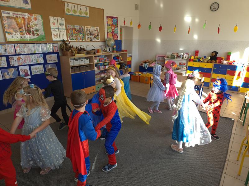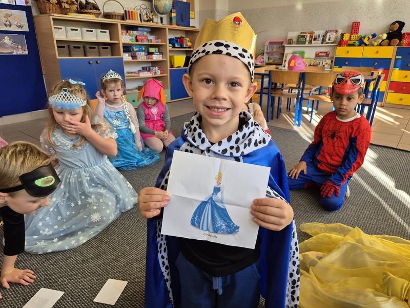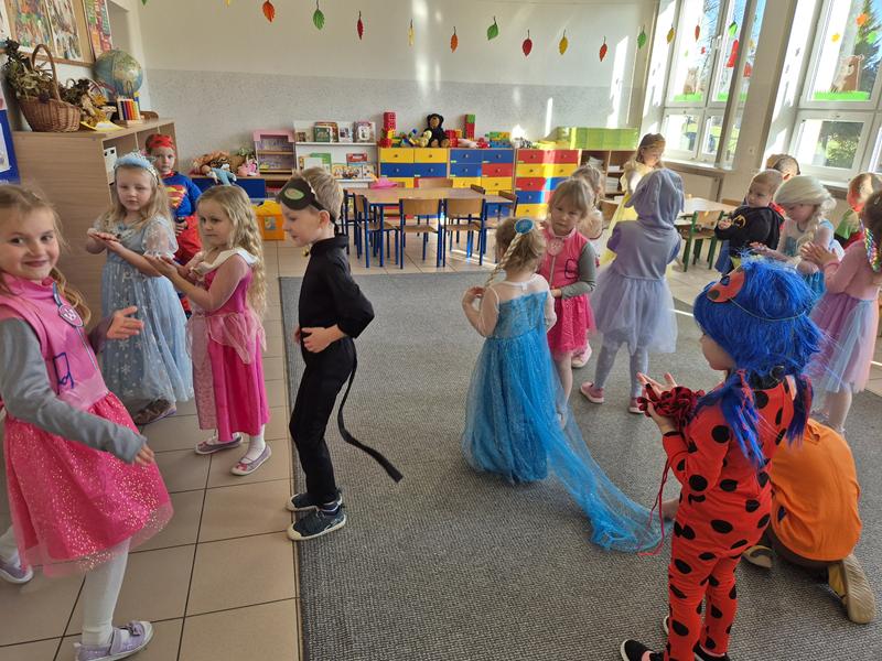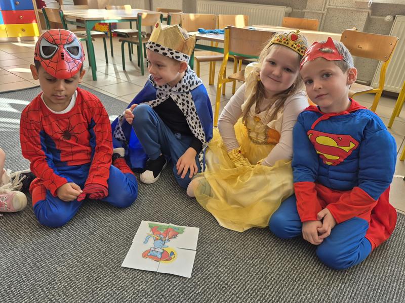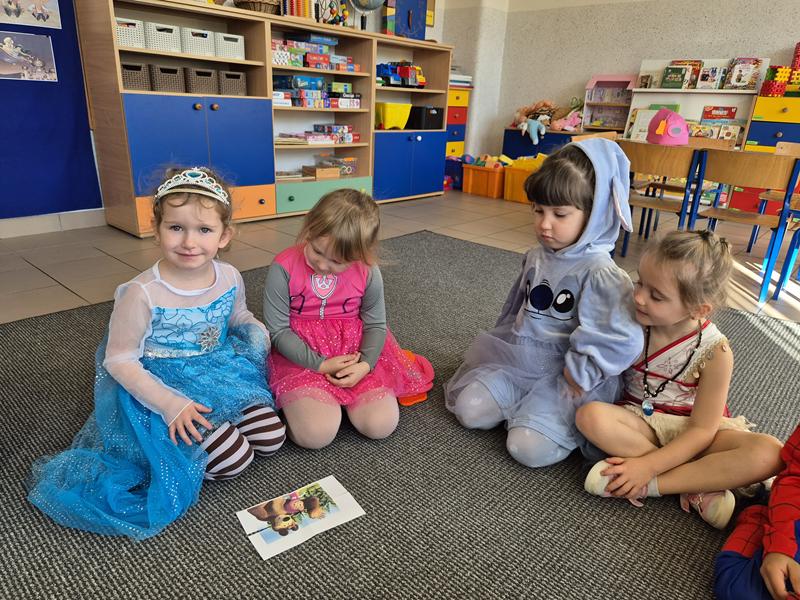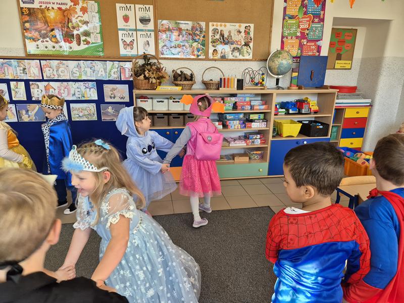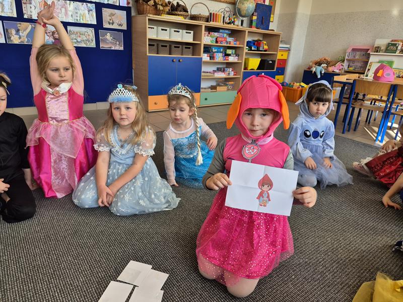 Do przedszkola przybyły dzieci przebrane w piękne bajkowe stroje. W tym dniu zabawom i tańcom nie było końca. Dzieci rozpoznawały bajkowe postaci i tytuły bajek po rekwizytach. Układały bajkowe puzzle. Rozwiązywały bajkowe zagadki i wykonywały bajkowe zadania. Były muzyczne zgadywanki bajkowe, zabawy ruchowe oraz prezentacje dziecięcych przebrań.