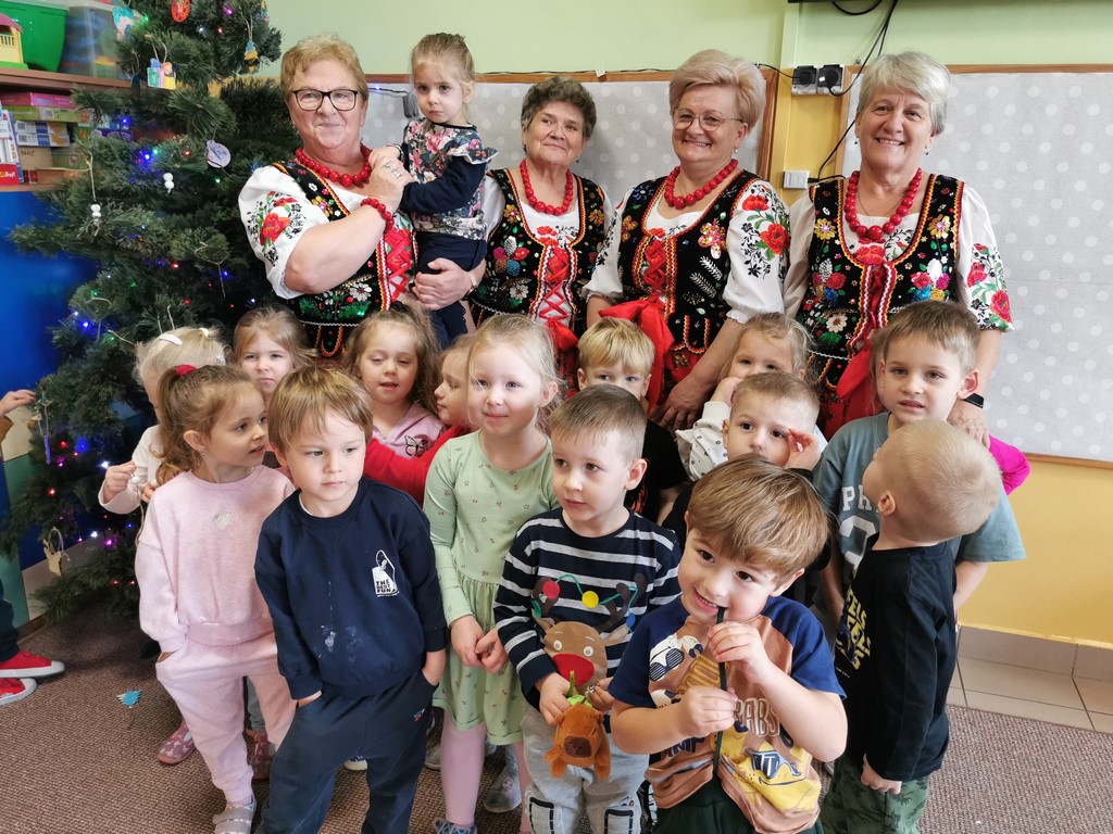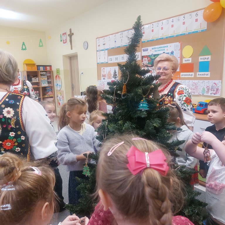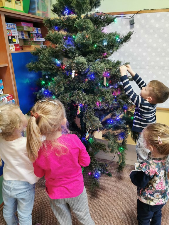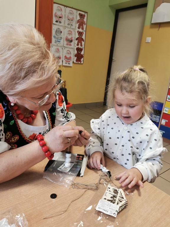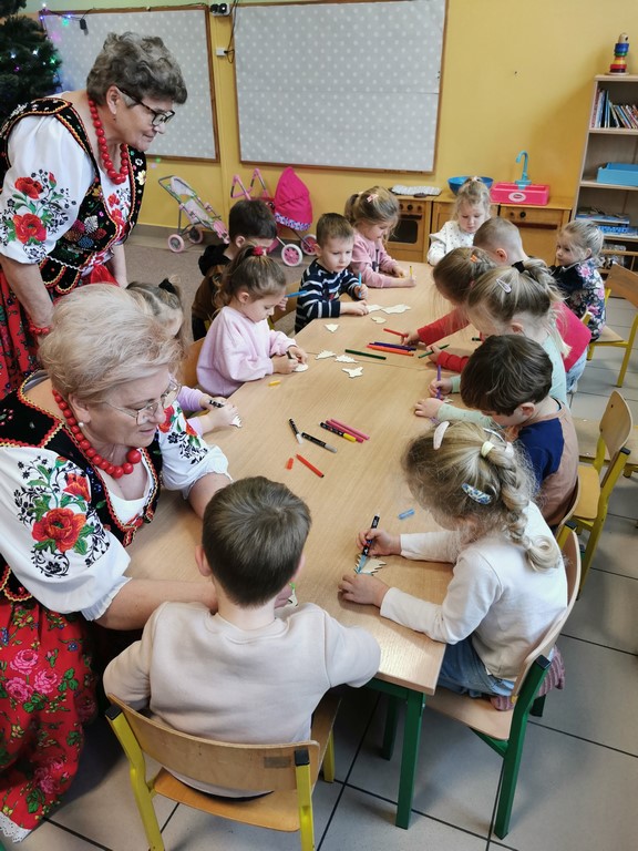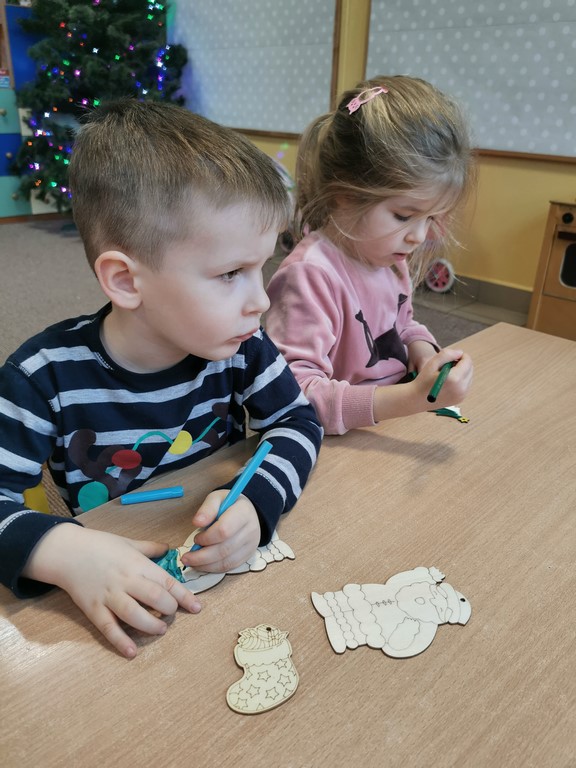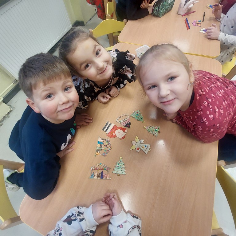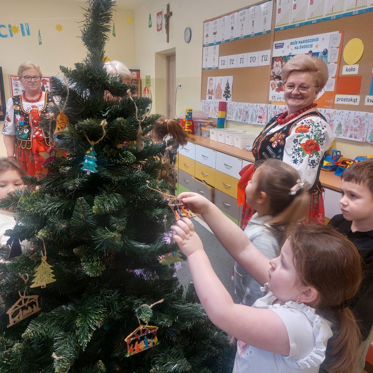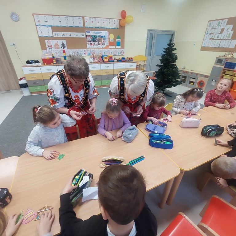 9 grudnia w naszym przedszkolu można już było poczuć świąteczną atmosferę. Tego dnia odwiedziły nas Panie z KGW w Tłuczani. Przedświąteczne spotkania z KGW stały się tradycją Przedszkola w Tłuczani i trwają już kilkanaście lat. W tym dniu Pani Ula, Pani Ania, Pani Wandzia i Pani Krysia przeprowadziły we wszystkich grupach przedszkolnych warsztaty plastyczne - „Przygotowujemy się do Świąt - robimy ozdoby choinkowe”. Panie opowiedziały dzieciom o tradycjach związanych ze Świętami Bożego Narodzenia, a następnie dzieci pod okiem Pań przygotowywały ozdoby na przedszkolną choinkę. Tym razem były to drewniane ozdoby - szopki, Mikołaje, aniołki, dzwoneczki, choinki, które dzieci ozdabiały flamastrami, kredkami, cekinami, koralikami, a następnie wieszały na choince. Przedszkolaki z zainteresowaniem słuchały instrukcji Pań oraz z zaangażowaniem ozdabiały nawet po kilka zawieszek. Na zakończenie dzieci zaśpiewały gościom piosenkę, podziękowały za warsztaty i zaprosiły Panie na przyszły rok.