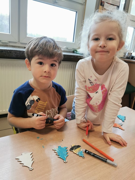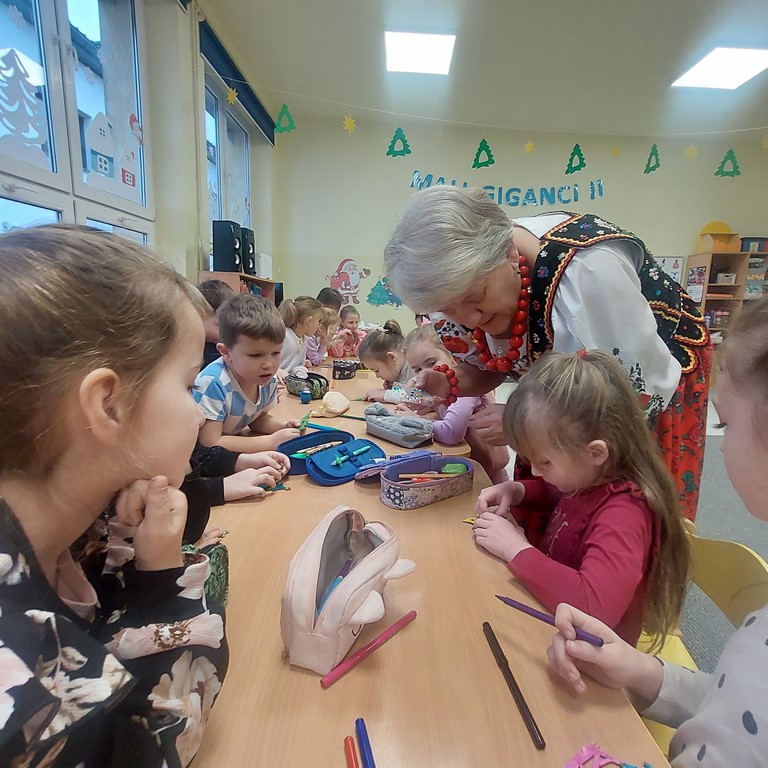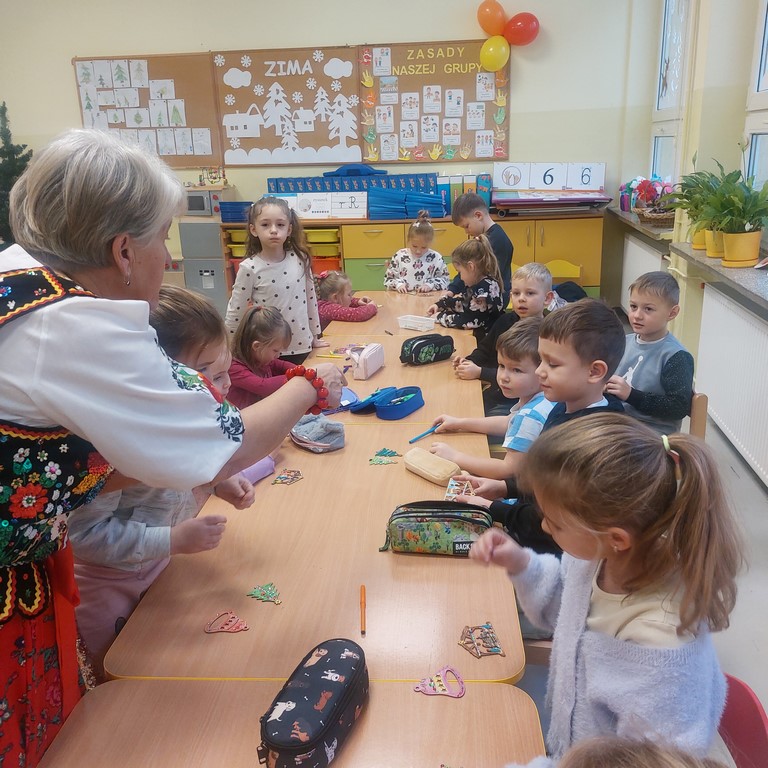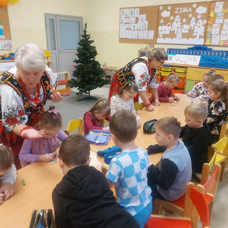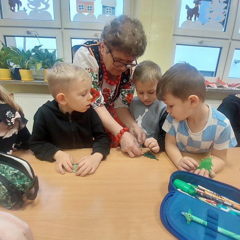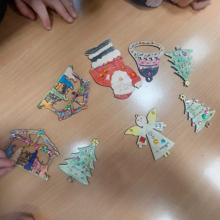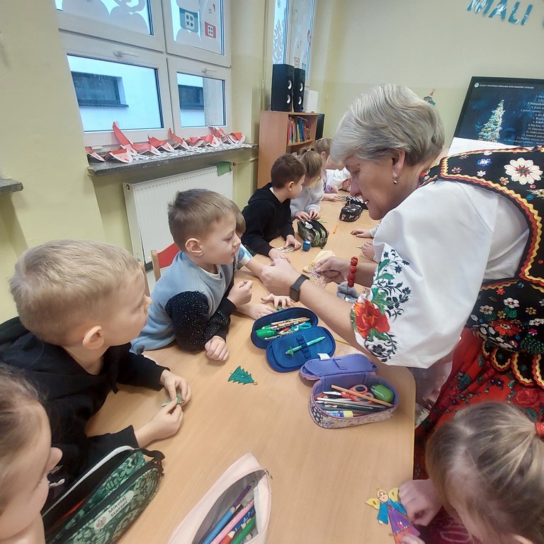 9 grudnia w naszym przedszkolu można już było poczuć świąteczną atmosferę. Tego dnia odwiedziły nas Panie z KGW w Tłuczani. Przedświąteczne spotkania z KGW stały się tradycją Przedszkola w Tłuczani i trwają już kilkanaście lat. W tym dniu Pani Ula, Pani Ania, Pani Wandzia i Pani Krysia przeprowadziły we wszystkich grupach przedszkolnych warsztaty plastyczne - „Przygotowujemy się do Świąt - robimy ozdoby choinkowe”. Panie opowiedziały dzieciom o tradycjach związanych ze Świętami Bożego Narodzenia, a następnie dzieci pod okiem Pań przygotowywały ozdoby na przedszkolną choinkę. Tym razem były to drewniane ozdoby - szopki, Mikołaje, aniołki, dzwoneczki, choinki, które dzieci ozdabiały flamastrami, kredkami, cekinami, koralikami, a następnie wieszały na choince. Przedszkolaki z zainteresowaniem słuchały instrukcji Pań oraz z zaangażowaniem ozdabiały nawet po kilka zawieszek. Na zakończenie dzieci zaśpiewały gościom piosenkę, podziękowały za warsztaty i zaprosiły Panie na przyszły rok.