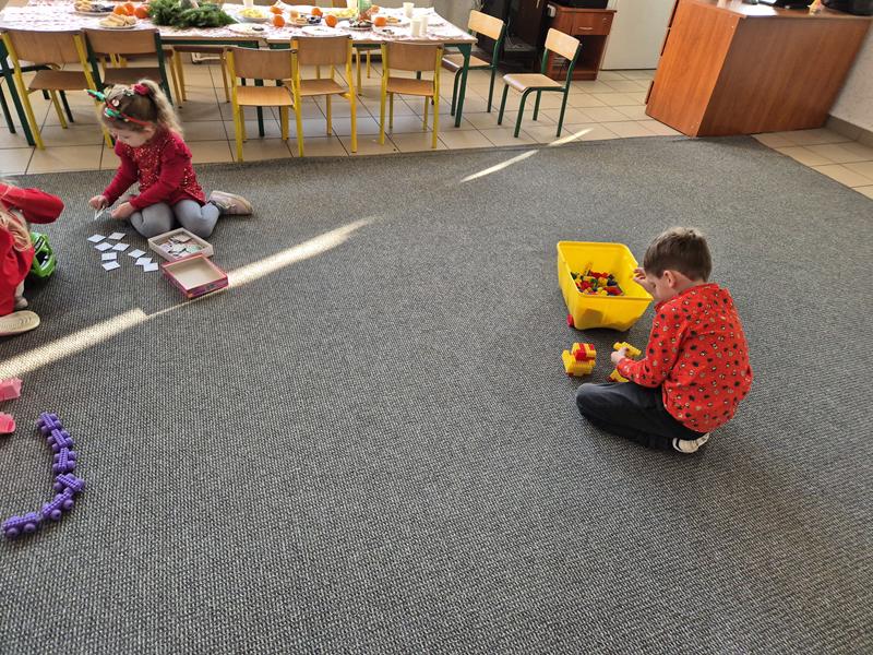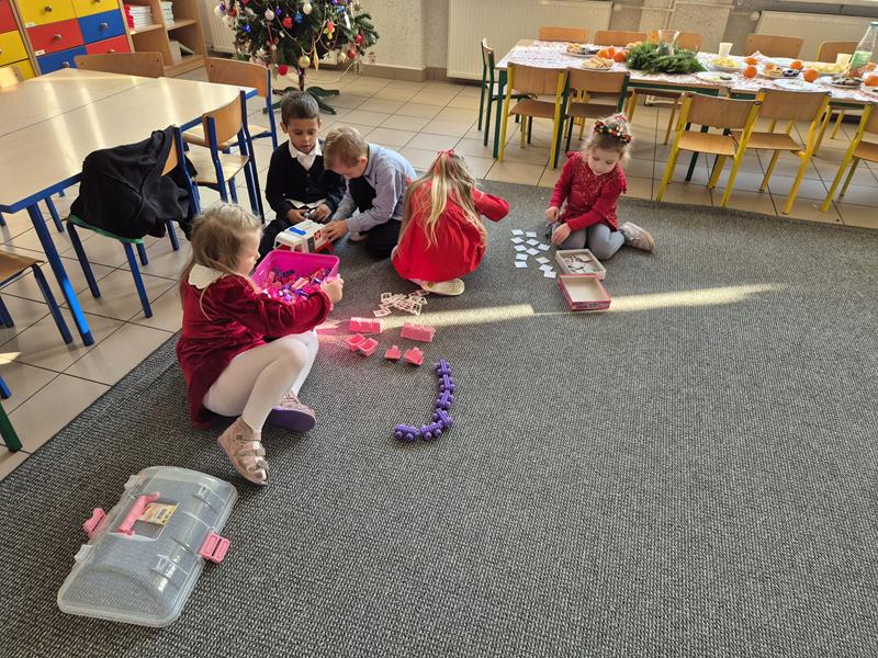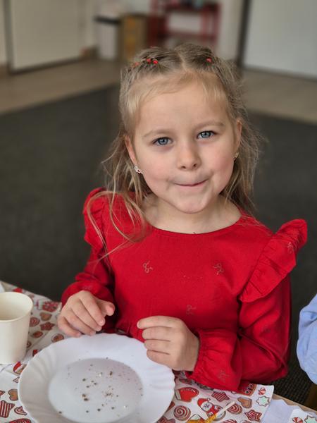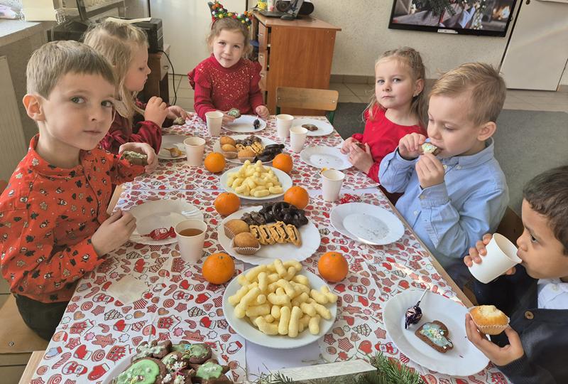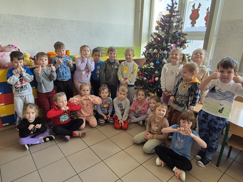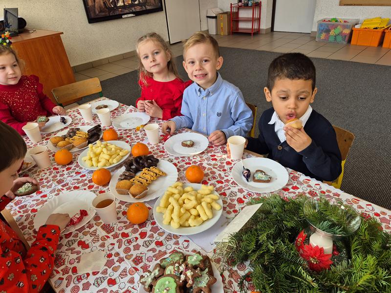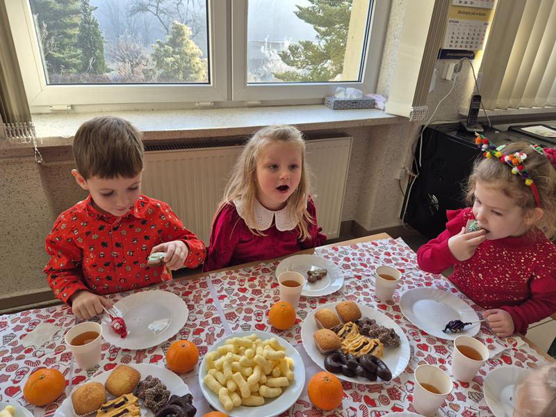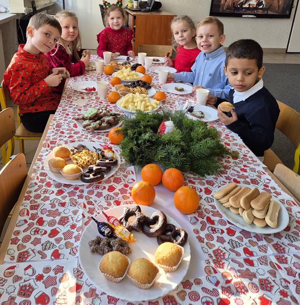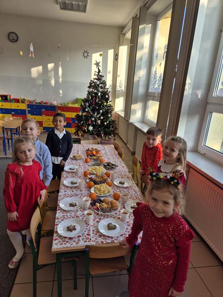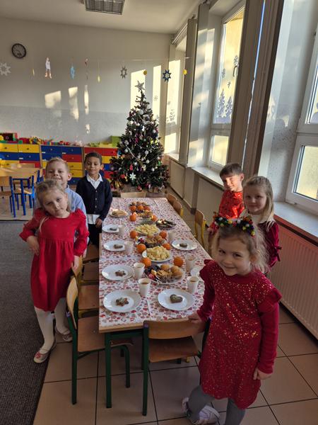 W piątek 19 grudnia odbyła się grupowa wigilijka. W sali przedszkolnej dzieci dzieliły się opłatkiem, składały sobie życzenia, a następnie zasiadły do pięknie przystrojonego stołu, na którym czekały „świąteczne przysmaki”. Nie zabrakło również wspólnego kolędowania. Czas upłynął w bardzo miłej, serdecznej atmosferze. Wszystkie dzieci czuły zbliżające się wielkimi krokami Święta Bożego Narodzenia.