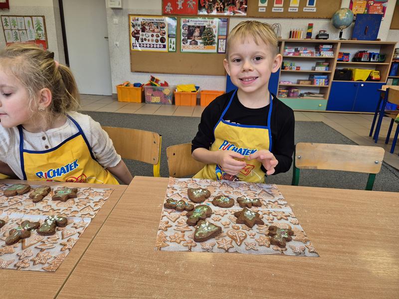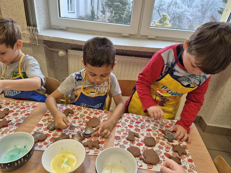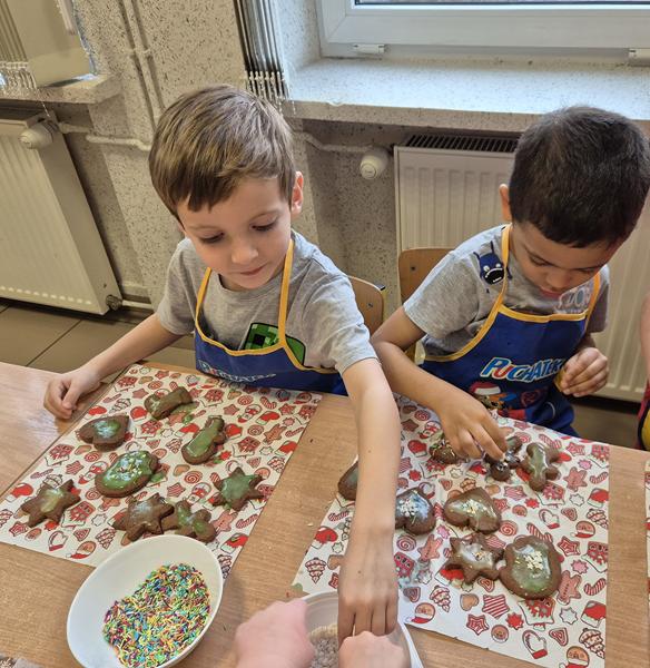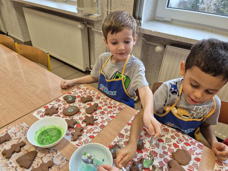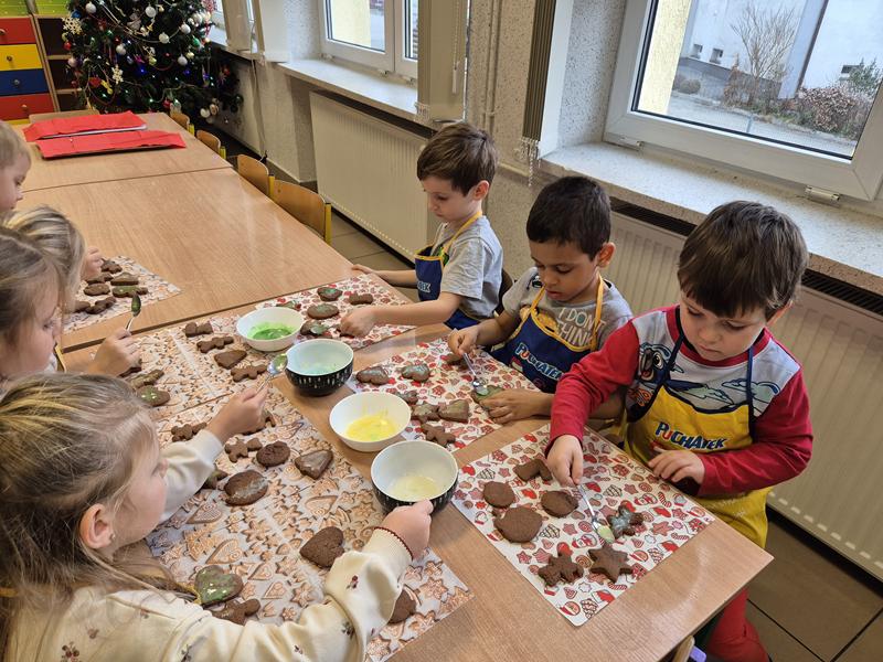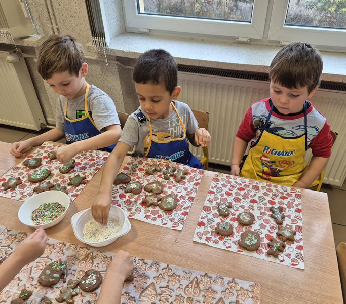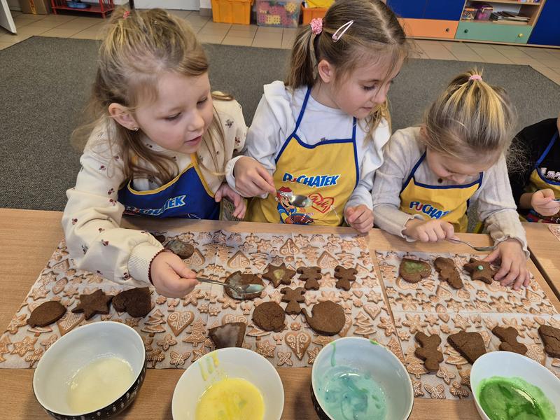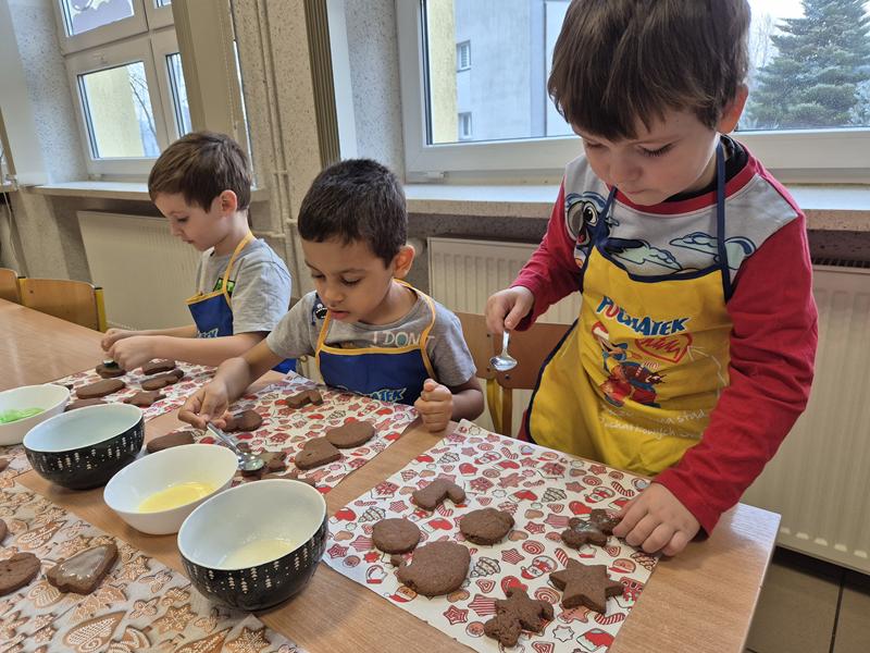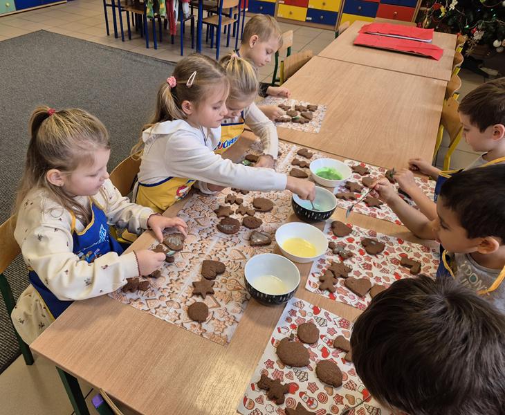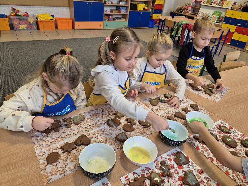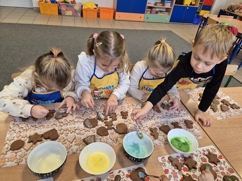 W naszej grupie czas oczekiwania na święta rozpoczęliśmy od ubierania choinki w bombki i ozdoby. Wiele radości sprawiło dzieciom wspólne tworzenie i wykrawanie pierniczków. Przedszkolaki z zapałem nakładały na ciasteczka lukrowe wzory w różnych kolorach. Następnie dodawały cukrowe posypki, jadalne koraliki i perełki, tworząc małe arcydzieła.