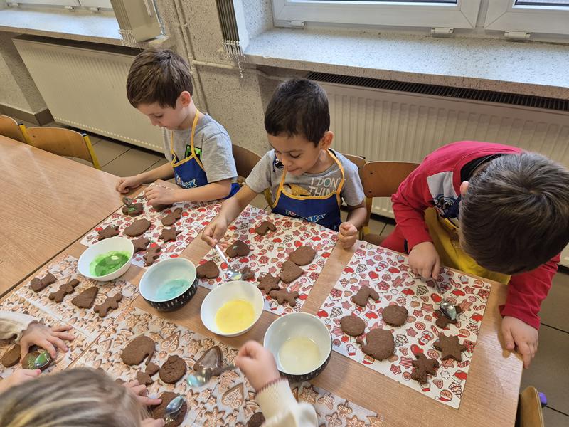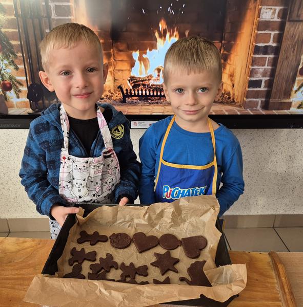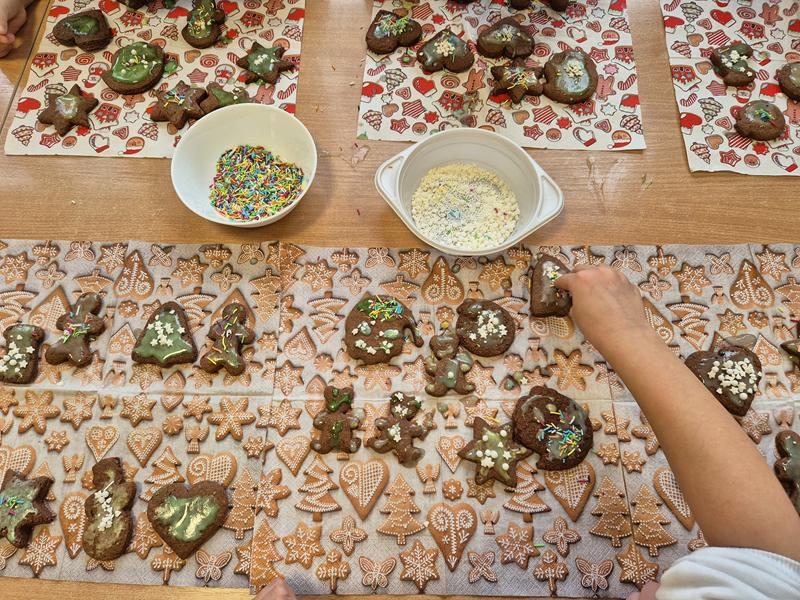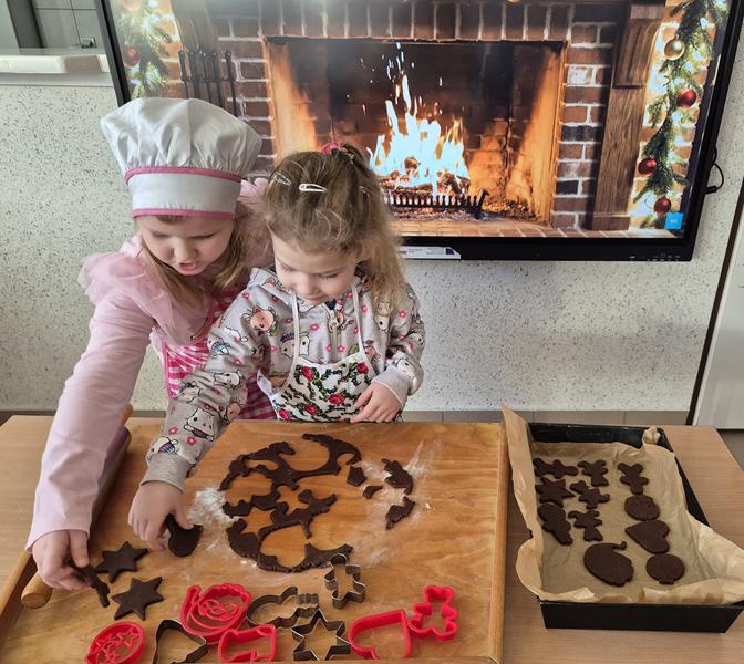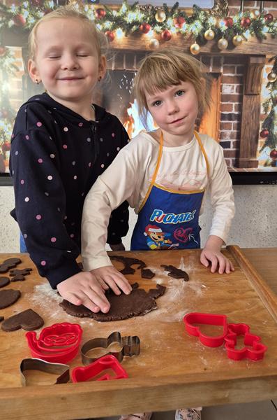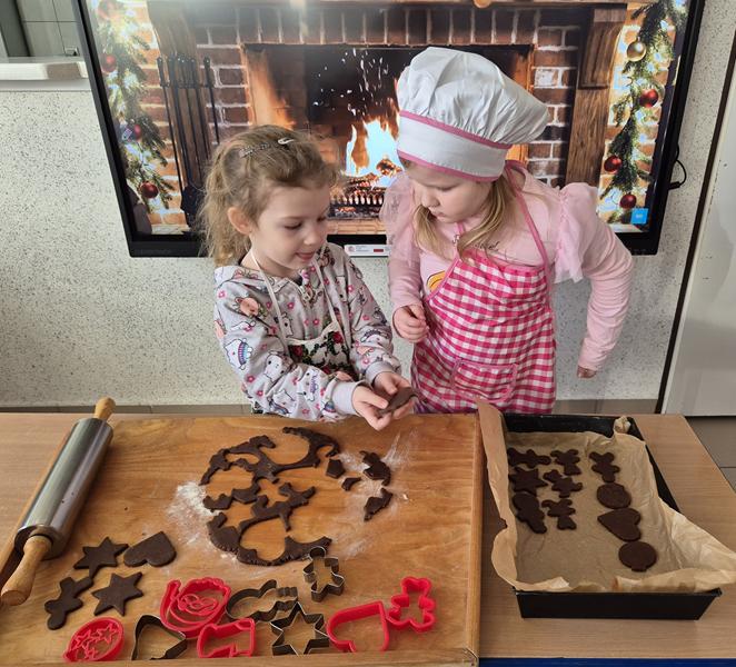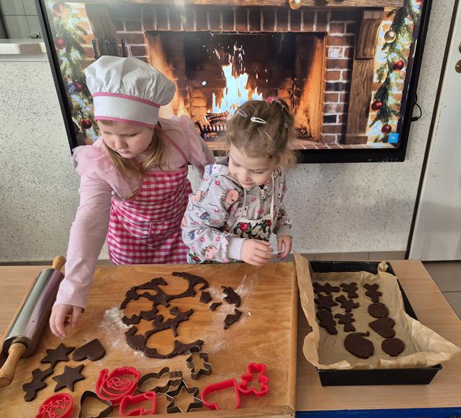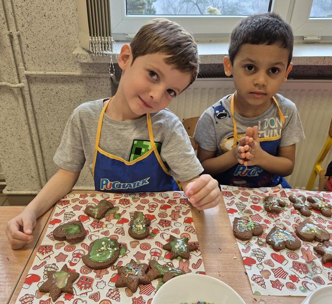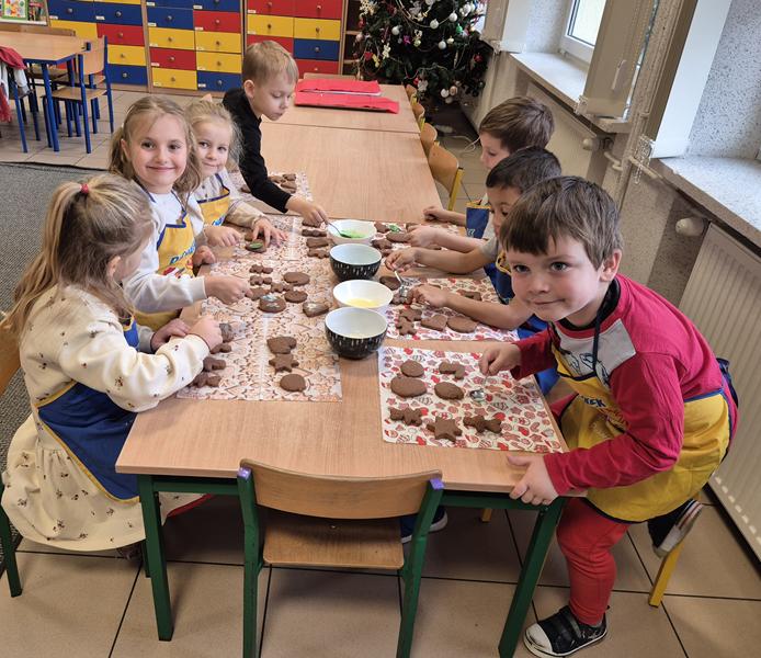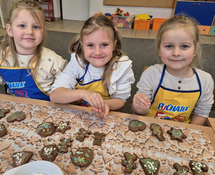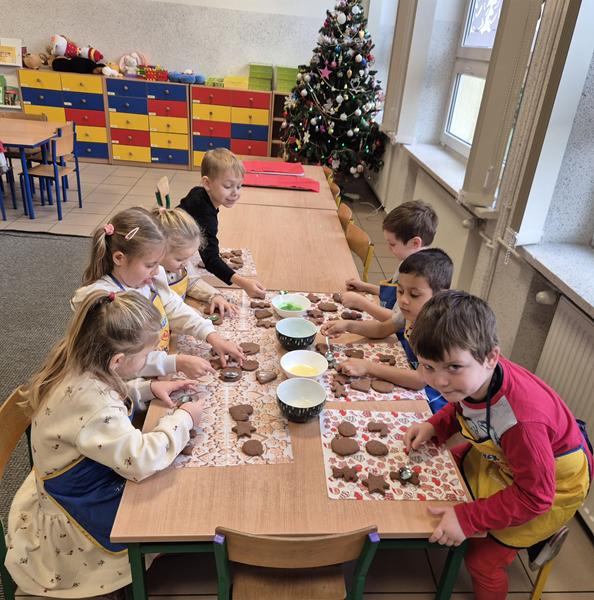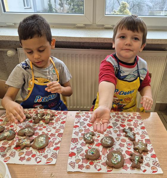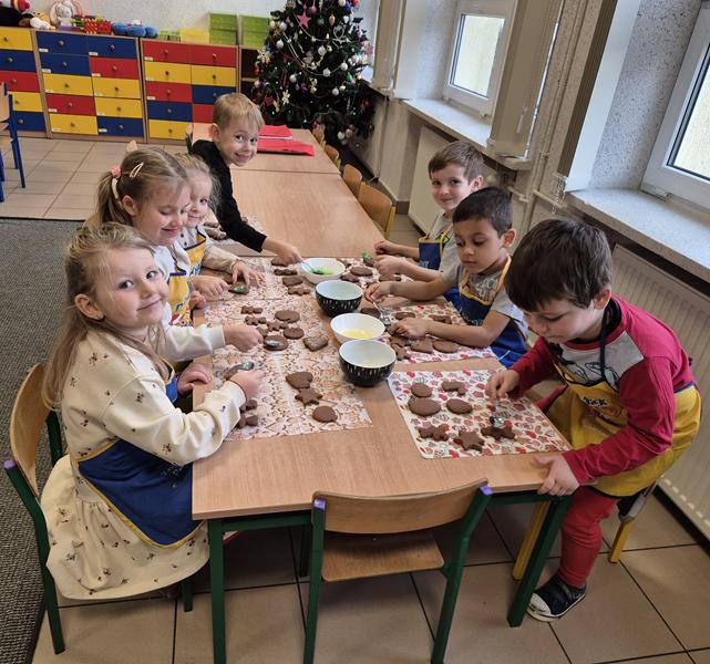 W naszej grupie czas oczekiwania na święta rozpoczęliśmy od ubierania choinki w bombki i ozdoby. Wiele radości sprawiło dzieciom wspólne tworzenie i wykrawanie pierniczków. Przedszkolaki z zapałem nakładały na ciasteczka lukrowe wzory w różnych kolorach. Następnie dodawały cukrowe posypki, jadalne koraliki i perełki, tworząc małe arcydzieła.